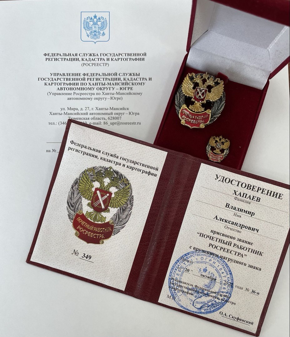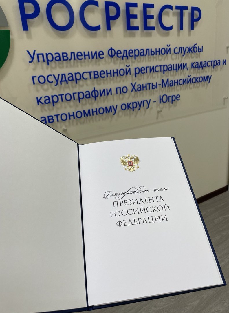 За безупречную и эффективную гражданскую службу руководителю Управления Росреестра по Ханты-Мансийскому автономному округу – Югре Хапаеву Владимиру Александровичу направлено благодарственное письмо Президента Российской Федерации Владимира Путина и присв