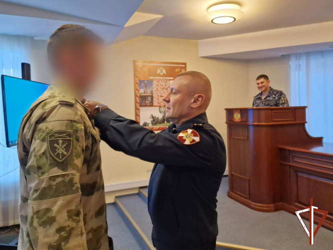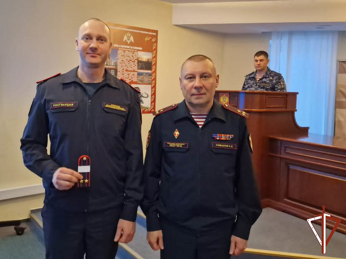 Приказом директора Росгвардии за усердие и отличие в службе медалью «За заслуги в укреплении правопорядка» награжден старший лейтенант Денис Б.