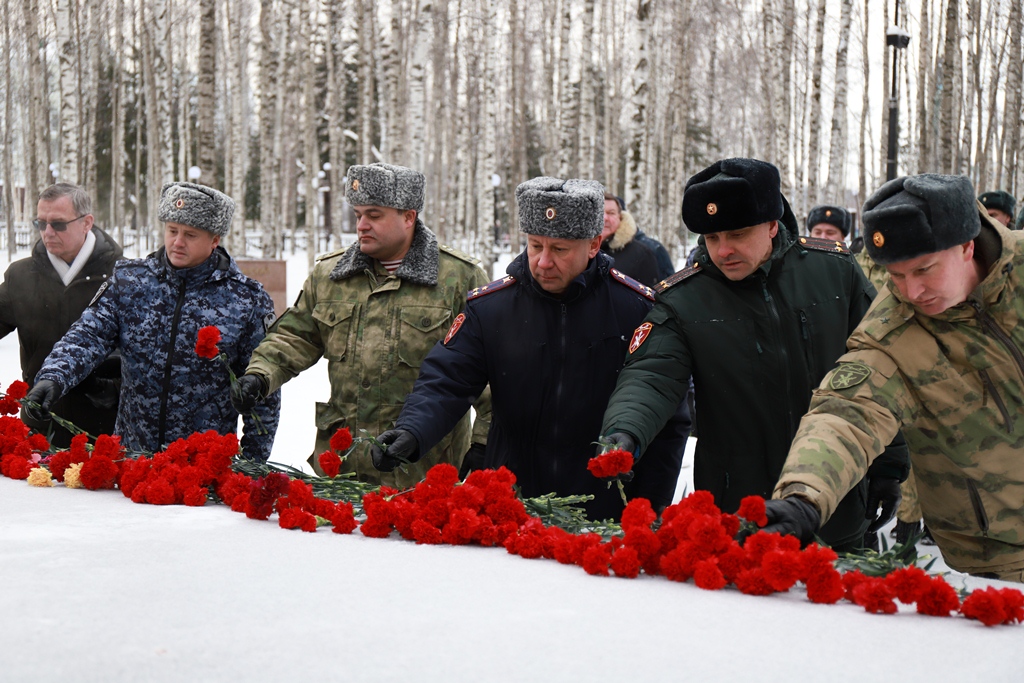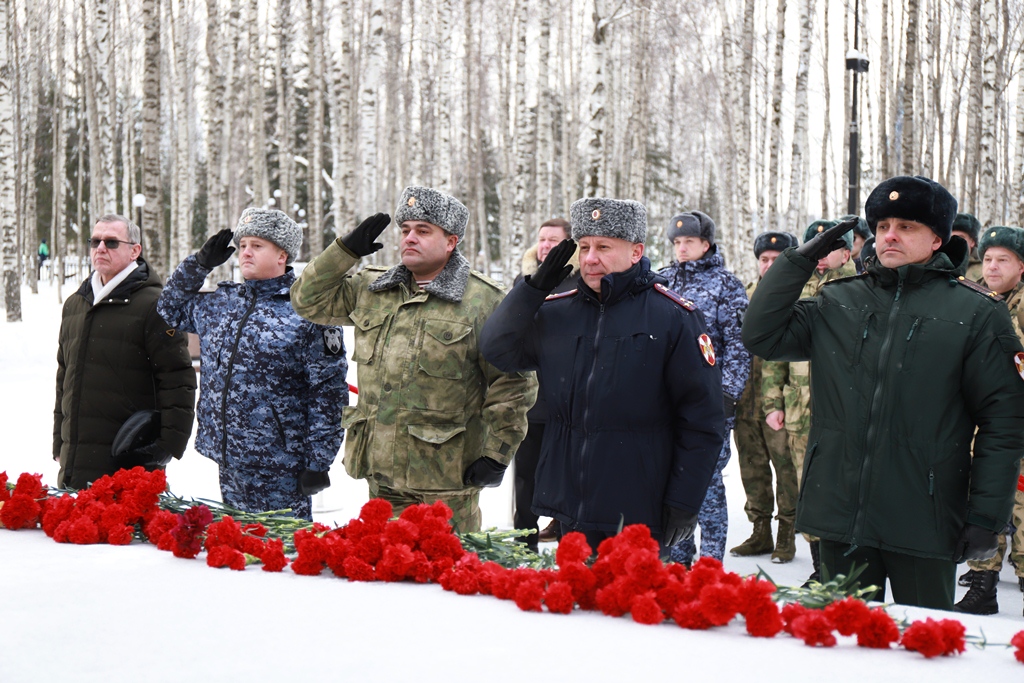 В ознаменование 80-летия со Дня полного снятия блокады Ленинграда начальник Управления Росгвардии по ХМАО – Югре полковник полиции Евгений Симаков, военнослужащие и сотрудники ведомства приняли участие в торжественной церемонии возложения цветов к Вечному огню Мемориала славы парка Победы Ханты-Мансийска.