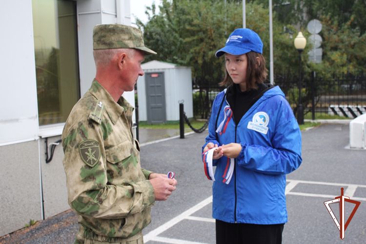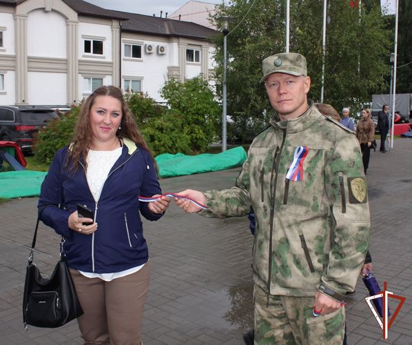 На плацу территориального ведомства состоялось торжественное построение личного состава Управления, в ходе которого волонтеры Победы вручили представителям Росгвардии ленты-триколор.