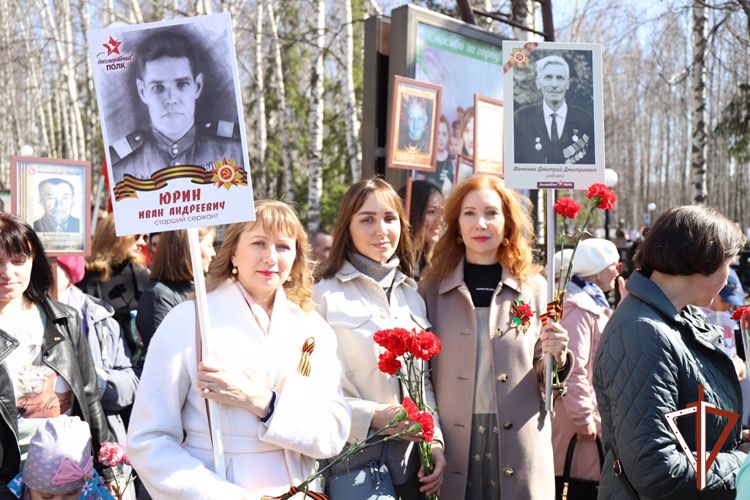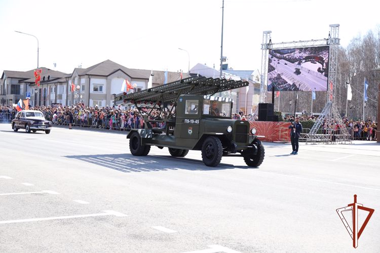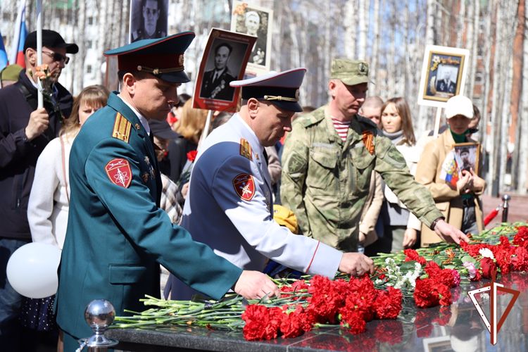 Вслед за военной техникой в составе шествия «Бессмертный полк» вместе с членами семей к Вечному огню Мемориала Славы воинам округа, погибшим в годы Великой Отечественной войны, организованной колонной во главе с начальником теруправления ведомства полковником полиции Евгением Симаковым прошли офицеры, прапорщики и сержанты Росгвардии. Совместно с руководством региона, ветеранами, представителями общественных и религиозных организаций, волонтерами Победы они возложили цветы и венки к подножию мемориала.