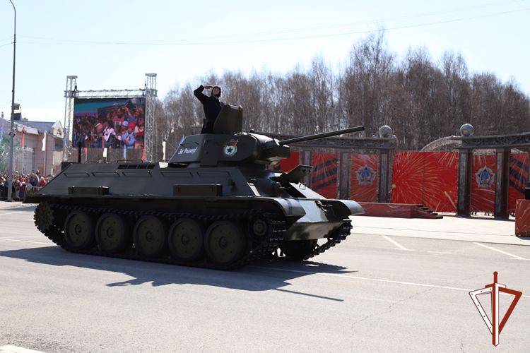 За пешими колоннами проследовала военная техника - легендарный танк Т-34, боевая машина «Катюша», автомобиль ГАЗ-67, мотоцикл «М-72».