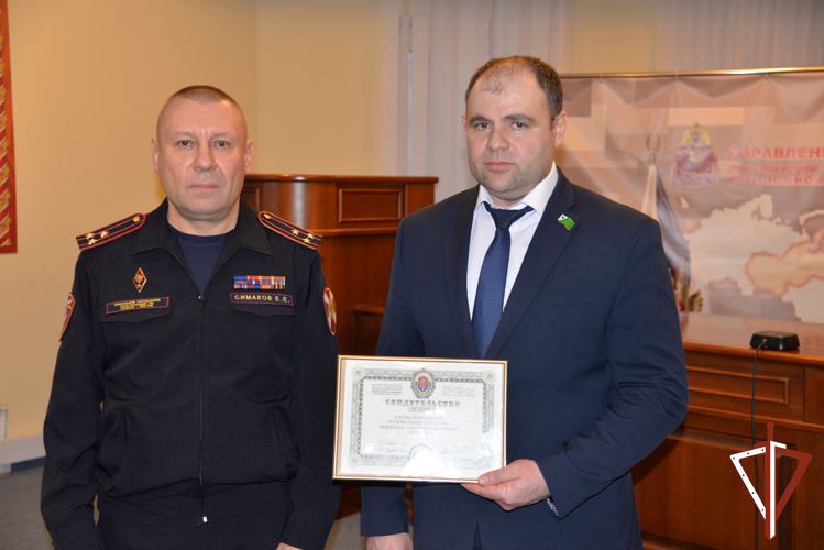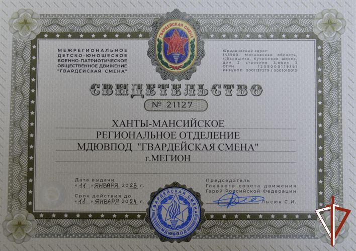 В Ханты-Мансийске начальник Управления Росгвардии по ХМАО – Югре полковник полиции Евгений Симаков в присутствии личного состава ведомства торжественно вручил свидетельство о регистрации регионального отделения Межрегионального детско-юношеского военно-патриотического общественного движения «Гвардейская смена» в г. Мегион Сергею Назарян.
