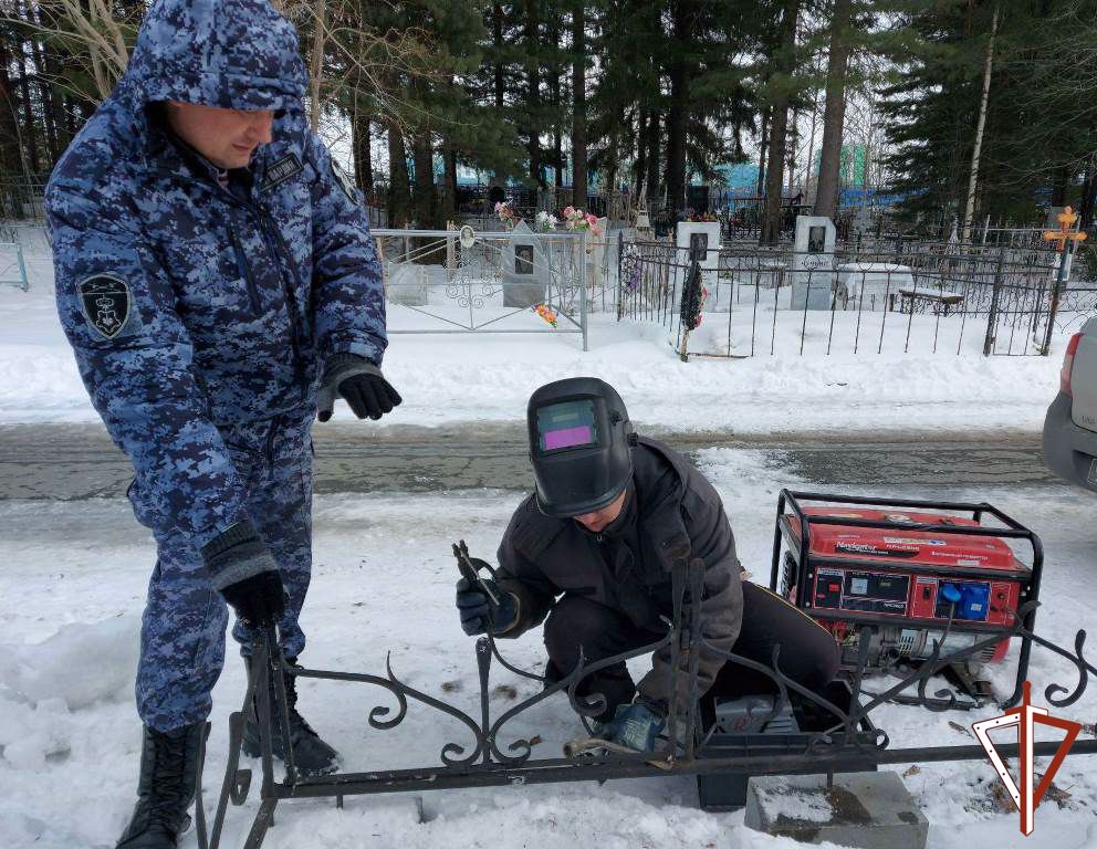 А на «Северном кладбище» в столице Югры сотрудники вневедомственной охраны провели сварочные работы по ремонту входной калитки ограждения и уборку от снега места захоронения и мемориальных плит рядового войск правопорядка кавалера Ордена Мужества Тихон Антона и его отца Владимира Михайловича.