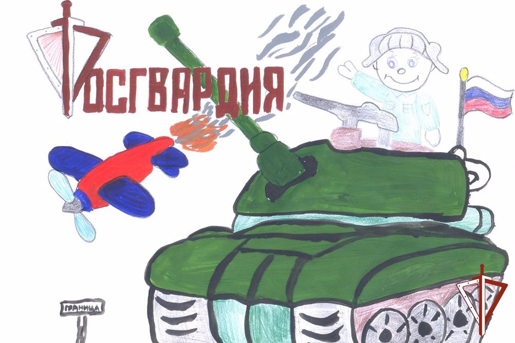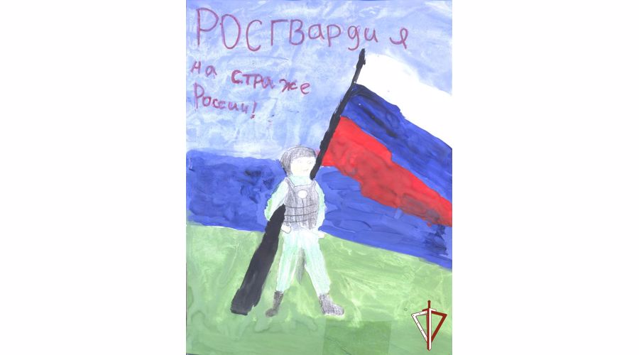 Так, Зайнутдинов Роман в своей работе отобразил военнослужащих Росгвардии с триколором, стоящих на страже правопорядка и безопасности в стране.