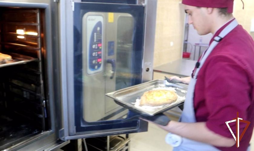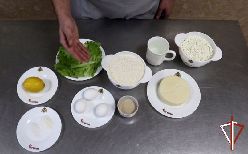 Первым делом военнослужащий замесил и раскатал тесто, придав ему форму лодочки. Затем подготовил начинку из сыра сулугуни с добавлением творога в равной пропорции и заполнил получившейся смесью заготовку хачапури. Противень с ней повар поместил в разогретую до 180 градусов Цельсия духовую печь и выпекал в течение 15-20 минут. Далее добавил желток куриного яйца и отправил в печь еще на пару минут.