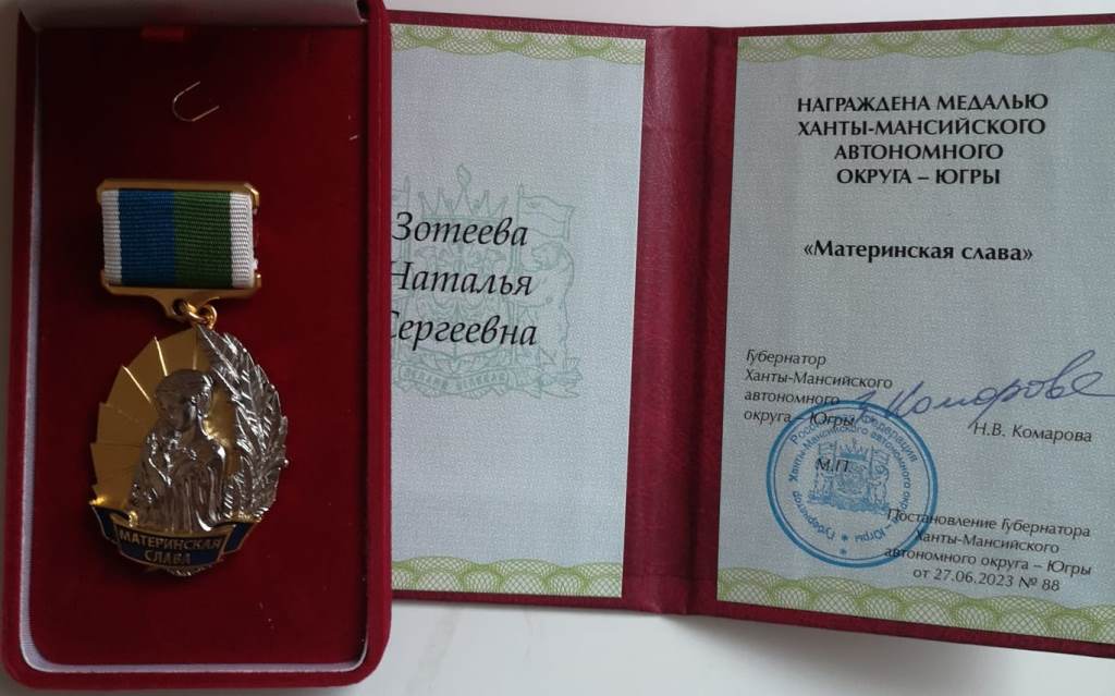 Губернатор Югры Наталья Комарова вручила инспектору вневедомственной охраны Управления Росгвардии по ХМАО – Югре старшему лейтенанту полиции Наталье Зотеевой медаль «Материнская слава», а ее супругу Павлу – медаль «Отцовская слава» за достойное воспитание пятерых детей.