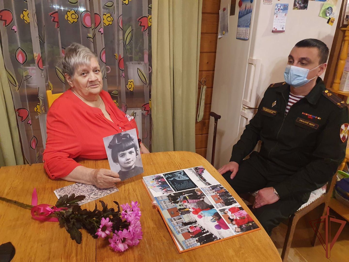 Лидия Васильевна Филатова поделилась с росгвардейцами своими воспоминаниями. Находясь на осажденной территории, она, 8-летняя девочка, пережила смерть родителей от болезней и голода, а ее крестная получила смертельное ранение на глазах у ребенка. Лидия Филатова была определена в детский дом, который в 1942 году эвакуировали на Север. Тогда дети чудом остались живы – когда переплывали на пароходе через Ладожское озеро, они попали под бомбежку.