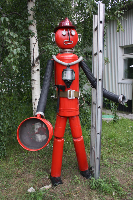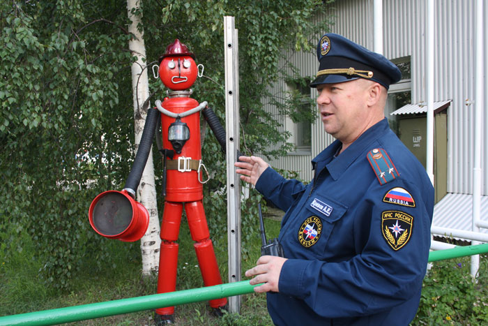 Чуть больше месяца назад на улице Пушкина возле 41 пожарной части 1 отряда федеральной противопожарной службы появилась необычная скульптура, которая сразу вызвала живой интерес у жителей и гостей города. Оригинальное, но в то же время специфичное исполнение никого из зевак не оставляет равнодушным! Чтобы узнать обо всех подробностях появления столь необычной для города скульптуры я отправилась в 41 пожарную часть. Как выяснилось, идея ее создания у брандмейстеров части возникла давно. А претворить в жизнь задумку помог недавний 45-летний юбилей Сургутского гарнизона пожарной охраны. Скульптура пожарного стала подарком от коллектива 41 части всем коллегам и жителям города. Рассказывает начальник 41 части 1 отряда федеральной противопожарной службы Александр Кривов: «Собирали мы нашего Паленого (прим. так назвали своего коллегу пожарные) всем миром, прямо в части. В ход пошли всевозможные предметы снаряжения пожарного, а также списанные огнетушители, всасывающие рукава, и даже фрагмент трехколенной лестницы. Есть у нашего Паленого каска, защитная маска и даже пояс с карабинами. Кстати, каску эту когда-то сделал своими руками ветеран пожарной охраны Михаил Вазгенович Аракелян. К сожалению, Михаила Вазгеновича уже нет в живых. Когда встал вопрос, что же надеть Паленому в качестве головного убора, мы сразу же вспомнили именно об этой каске. Идей было много, впрочем, как и составных частей. Нашего Паленого мы создавали прямо на асфальте перед частью, складывая его из подручных материалов. Как видите, пожарные 41 части не только профессионалы в своем деле, но и люди творческие. И то, что сургутян наш металлический коллега так заинтересовал, означает, что у нас неплохо получилось!» Надо отметить, что пожарник Паленый может служить не только украшением города, но и наглядным пособием для тех, кого интересует пожарное дело! Естественно, что выполнен он в красном цвете – если можно так сказать, в корпоративной пожарной окраске. Коллектив 41 пожарной части считает его не просто скульптурой, а своим 97-м по счету сотрудником. «Иногда приедешь с очередного пожара уставшим, посмотришь на него – и на душе как-то сразу легче становится!», - подчеркнул Александр Кривов. К сожалению, проблема вандализма не обошла и Паленого стороной. Буквально прошедшей ночью кто-то из хулиганов оторвал у статуи защитную маску! Но коллеги-пожарные сразу же нашли ей замену. Так что Паленый снова гордо стоит в полной боевой готовности – хоть сейчас на пожар отправляй! Если, конечно, вандалы вновь не атакуют!