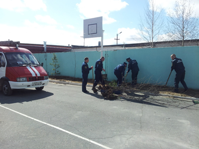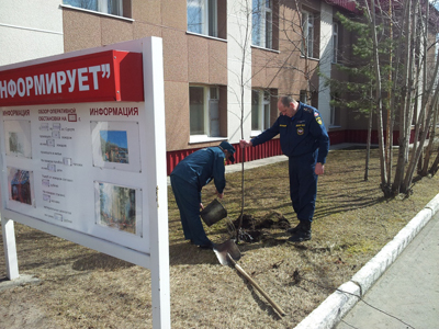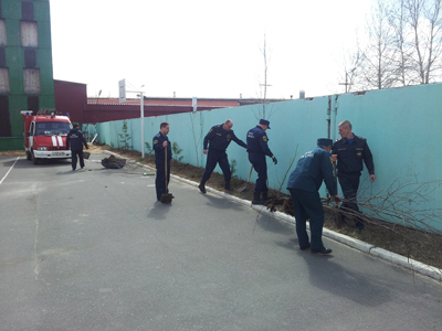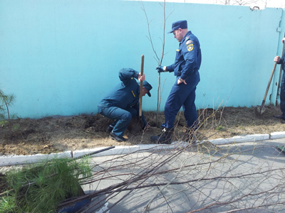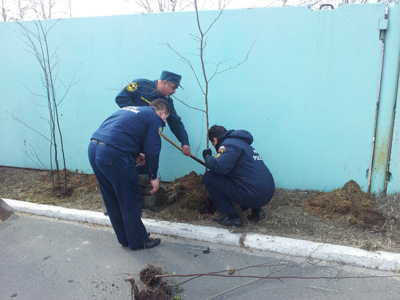 стараясь не повредить хрупкие деревца, спасатели высадили на территории части
