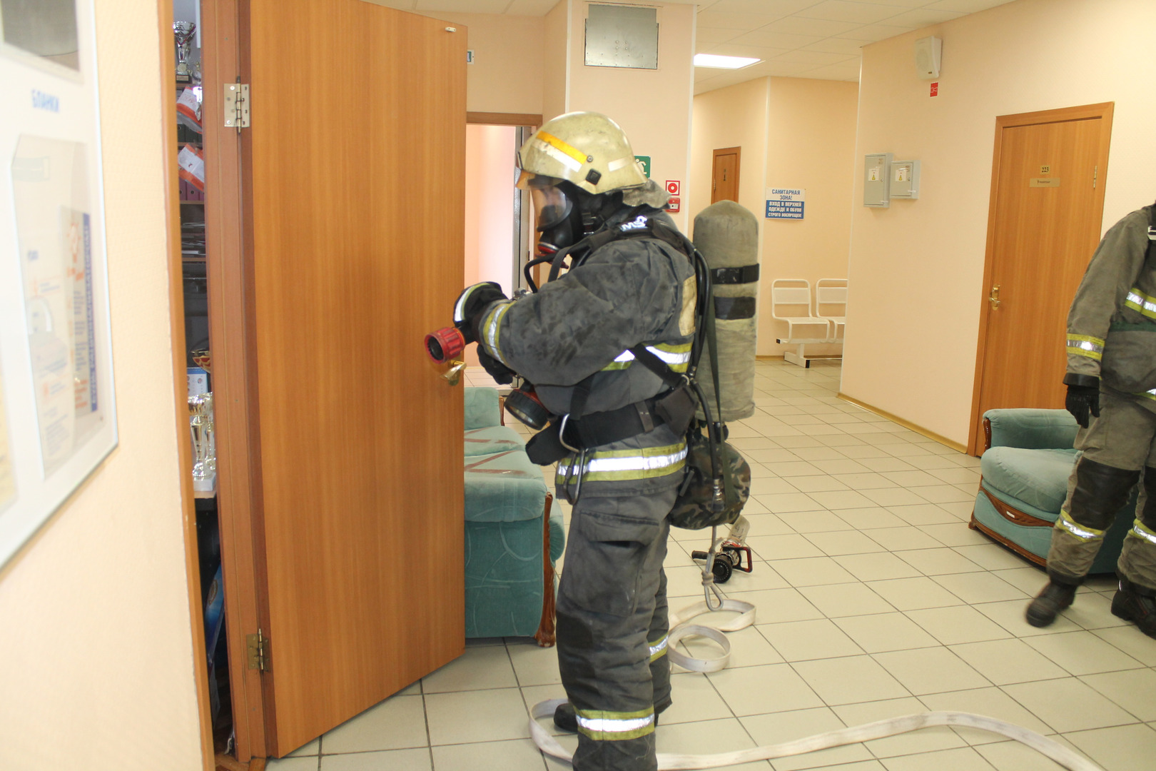 В результате условного задымления на пульте объекта сработала автоматическая пожарная сигнализация и оповещение людей с просьбой немедленной покинуть здание. Охрана сообщила о произошедшем в пожарно-спасательную службу и приступила к эвакуации людей и первичным действиям по тушению пожара.