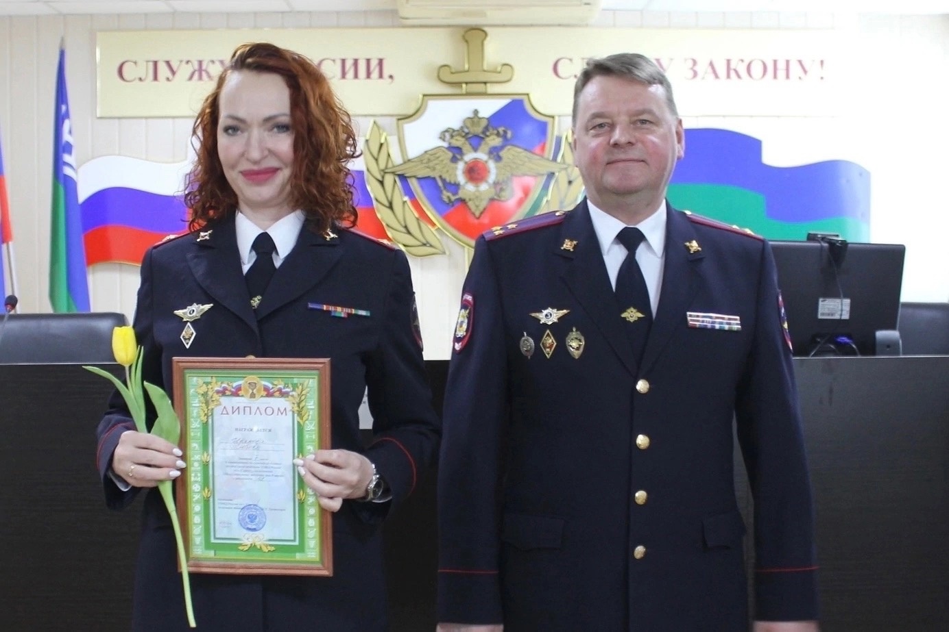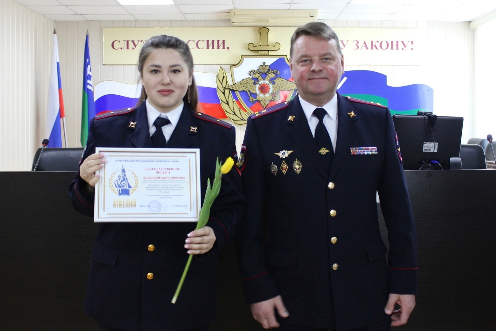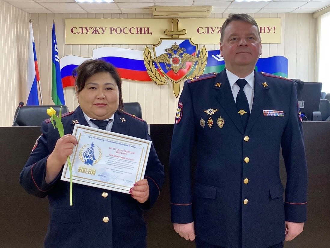 Благодарственные письма директора Сургутского института экономики, управления и права получили начальник отделения по связям со средствами массовой информации майор внутренней службы Елена Прокопиевна Ким и инспектор по анализу, планированию и контролю штаба младший лейтенант внутренней службы Алина Рамилевна Кашапова.