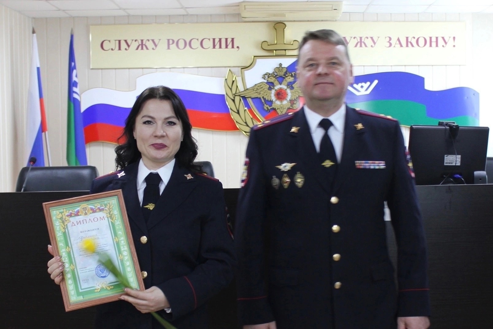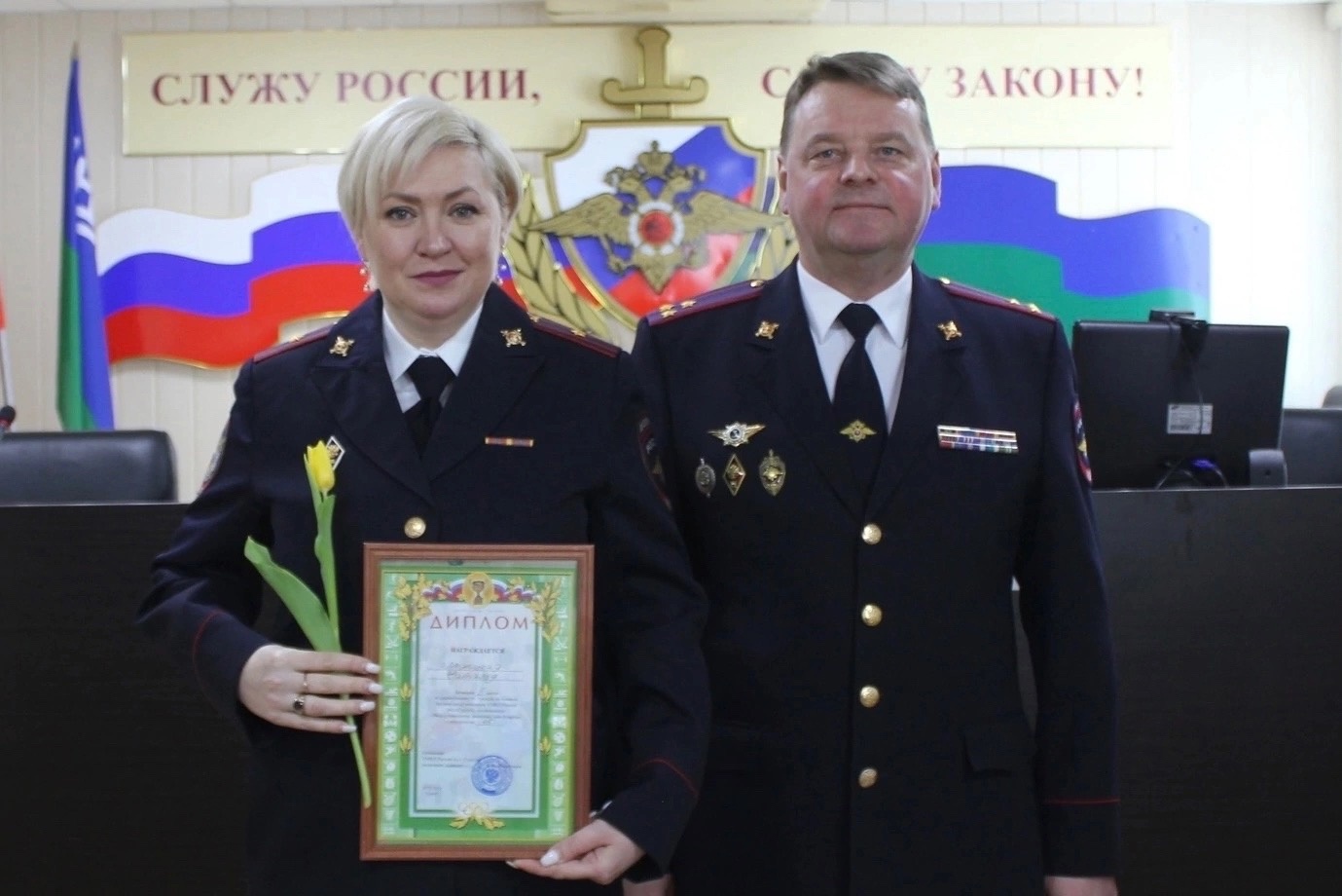 В актовом зале Управления сотрудниц поздравили добровольцы регионального отделения Всероссийского студенческого корпуса спасателей в ХМАО-Югре. От имени руководства Отделения и председателя Общественного совета при УМВД России по г.Сургуту С.М.Косенка ребята зачитали Памятные адреса и вручили присутствующим женщинам цветы. На мероприятии начальник УМВД полковник полиции Виталий Петрович Провоторов бухгалтеру-ревизору группы финансово-кредитных ревизий отдела экономической безопасности и противодействия коррупции Людмиле Евгеньевне Павленко вручил медаль «За трудовую доблесть», ряд сотрудниц награждены Почетными грамотами.