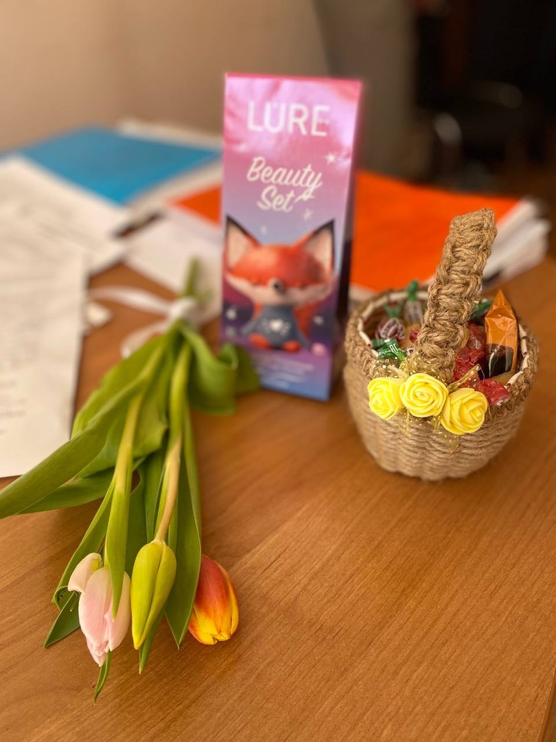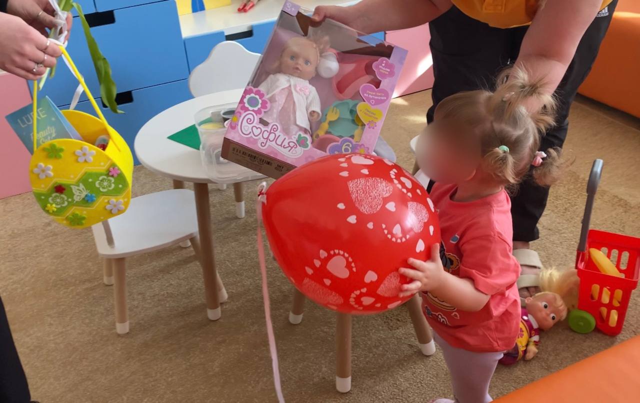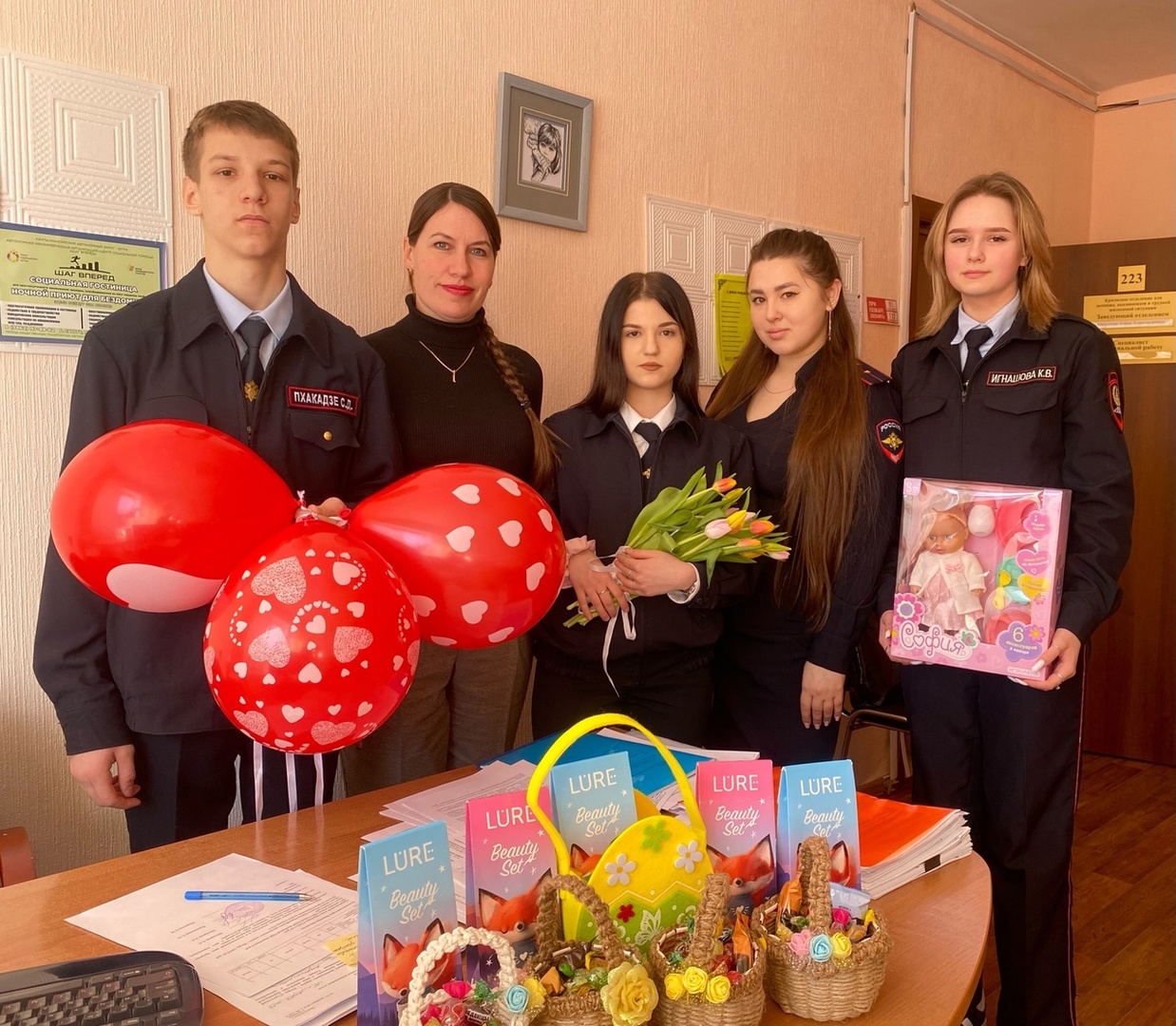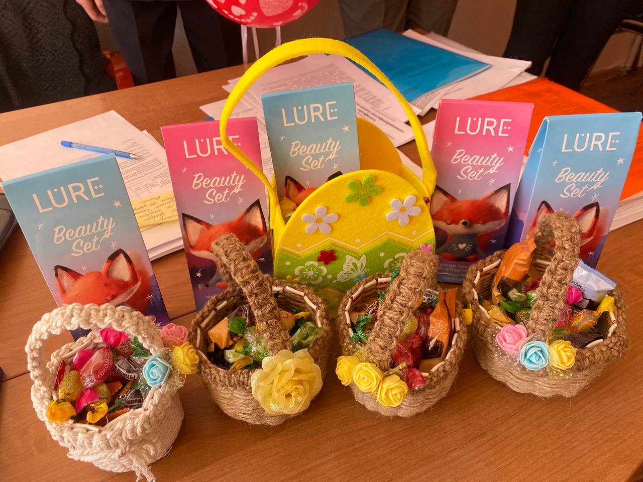 Представительницам прекрасной половины человечества вручены цветы, корзинки с конфетами и небольшие косметические наборы, а самой маленькой - шарики и кукла.