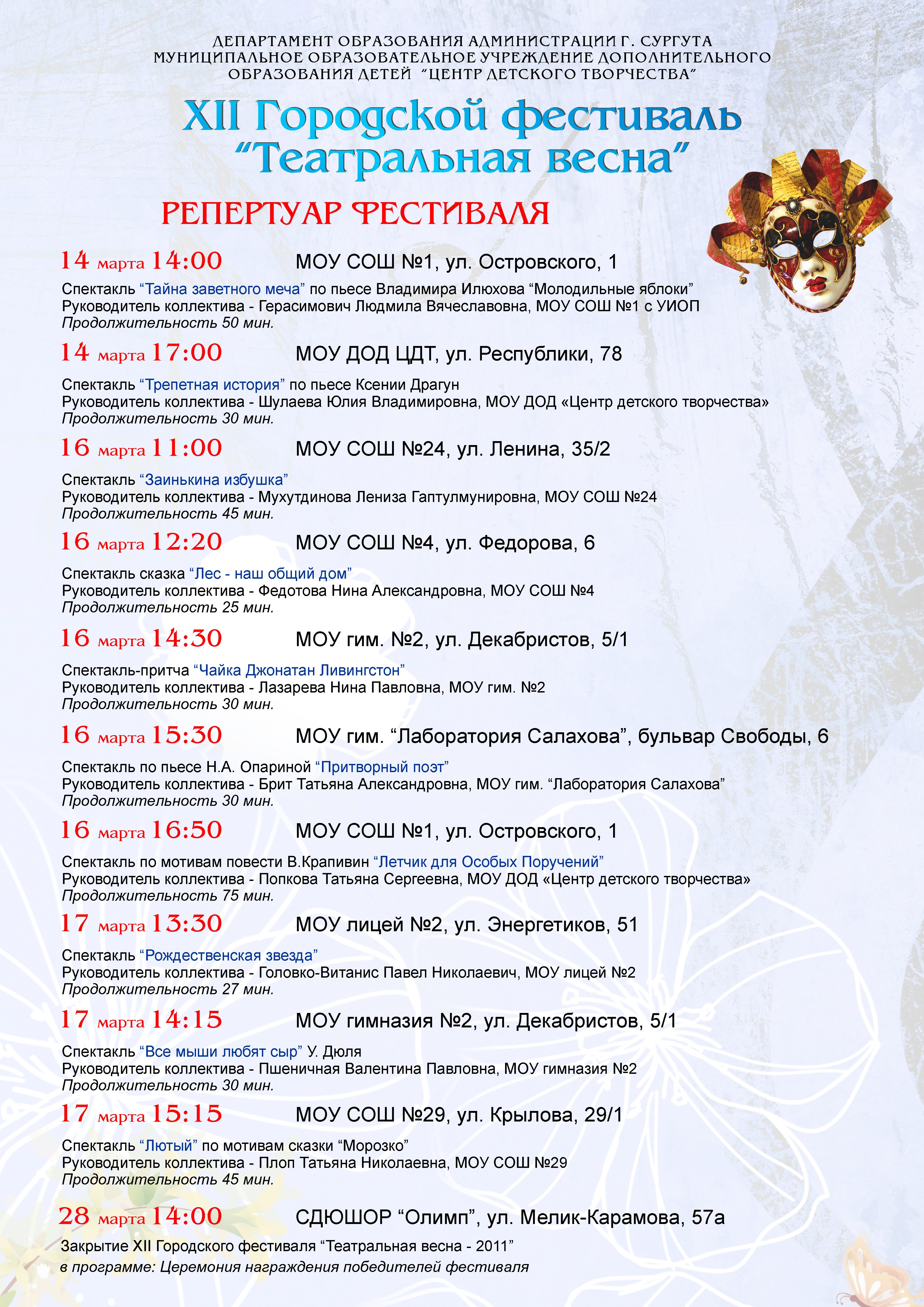 · 14.00 - открытие фестиваля театральных коллективов образовательных учреждений «Театральная весна», школа №1, ул. Островского1, тел.: 61-14-95, Утетледова Гульнара Серикбаевна. Программа прилагается