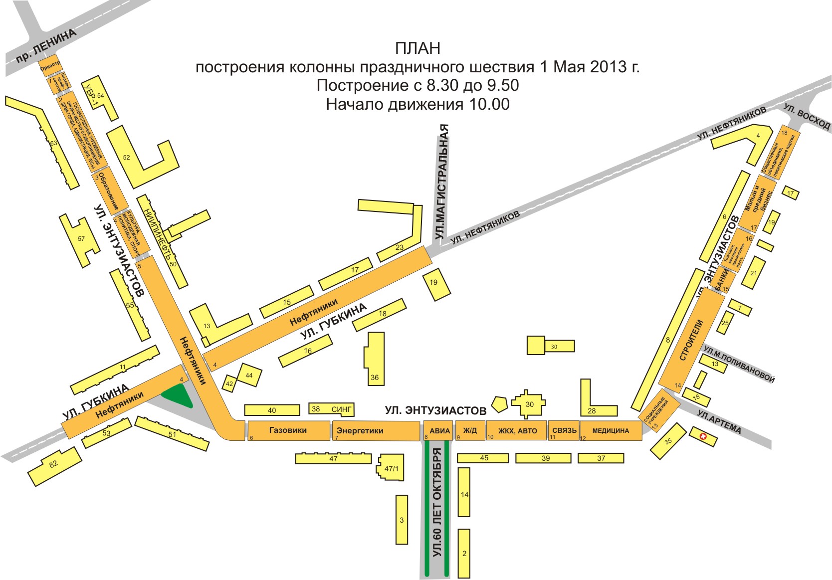 · 10.00 – шествие, посвященное празднику Весны и Труда.План построения колонн, схема праздничного шествия прилагаются