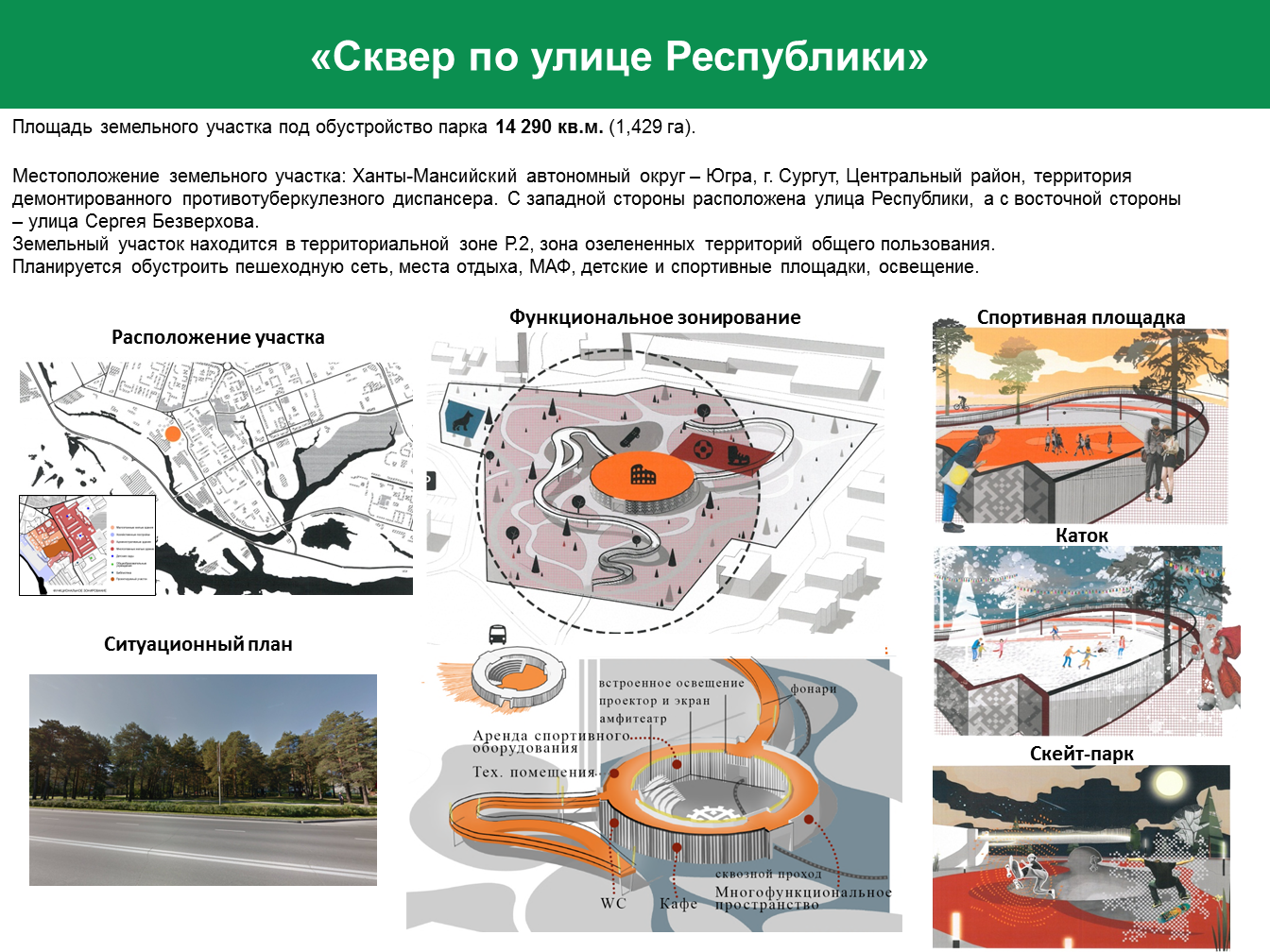 На портале «Открытый регион-Югра» сургутяне определяют очередность благоустройства парков и скверов. Жителям предлагают один из четырех объектов: парки в 38-м и в 20 «А» микрорайонах, предложенный жителями парк в 43 микрорайоне и сквер по улице Республики. Последний – единственный из четырех объектов, который можно преобразить в один этап, с мая по октябрь. Это связано с небольшой площадью территории. Размер сквера, где растут сосны, ивы и березы, составляет более 14 тысяч квадратных метров. Концепция сквера уже есть. Ее разработали участники Всероссийского урбанистического хакатона. Она предусматривает многофункциональное футбольное поле, которое зимой будет превращаться в каток, а также скейт-парк, амфитеатр, пешеходные и велодорожки, освещение. На ее основе и с учетом мнения жителей подготовят проектно-сметную документацию.