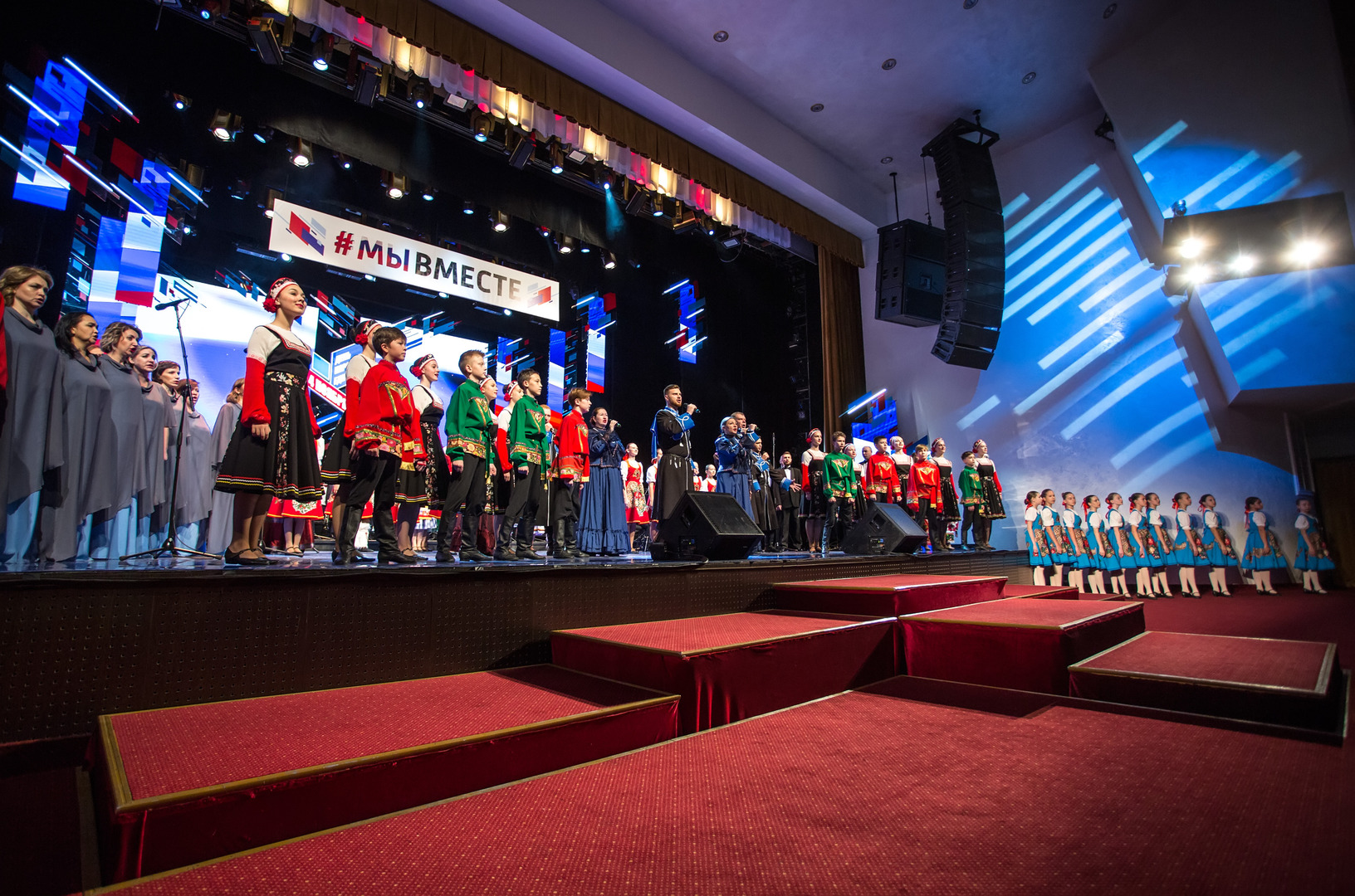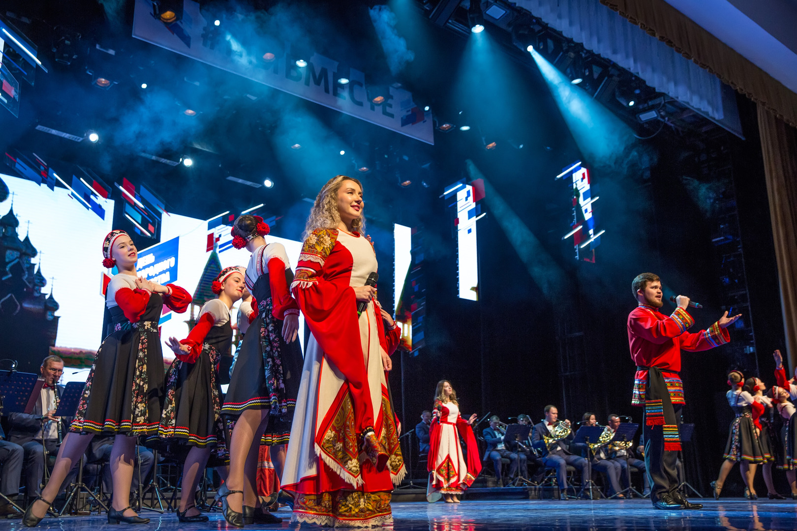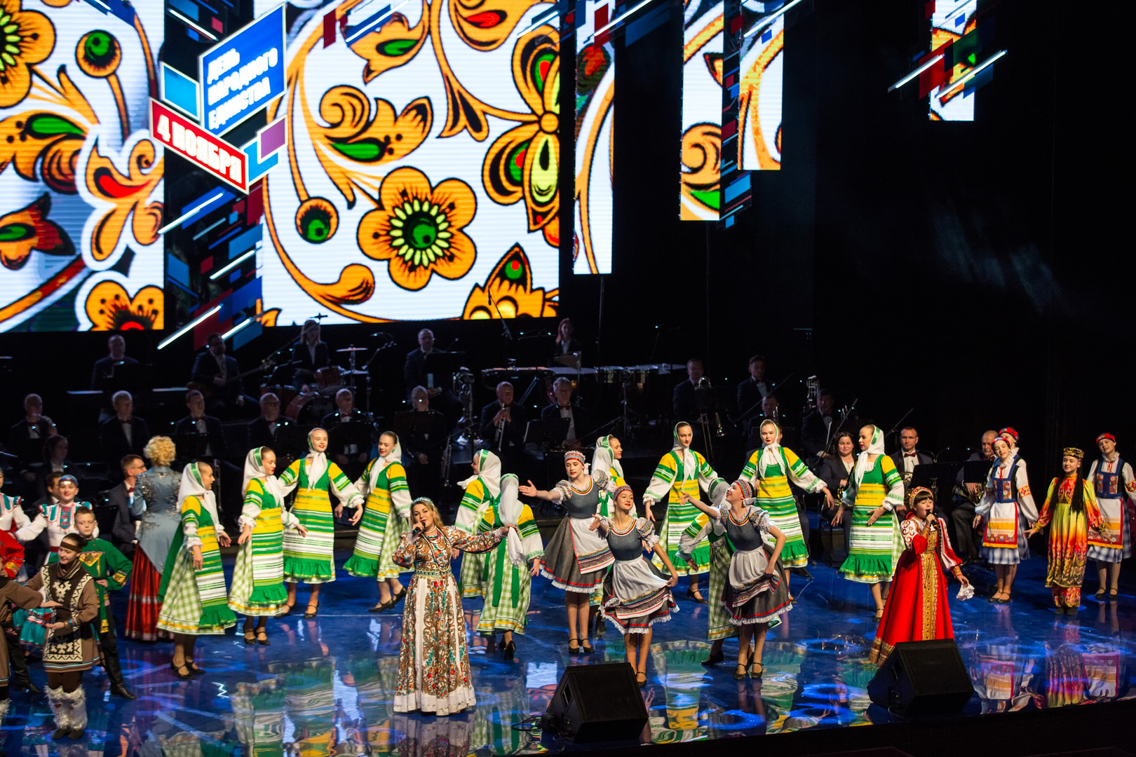 Концерт на одной сцене стал символом объединения многонациональной Отчизны. Началась программа с исполнения гимна Российской Федерации.