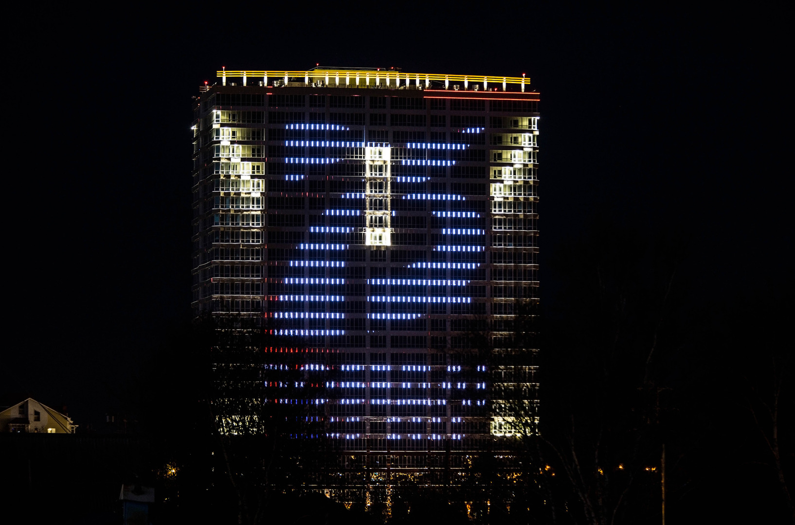 Первая в округе: к 75-летию Победы в Сургуте 25-этажный дом украсила впечатляющая тематическая иллюминация