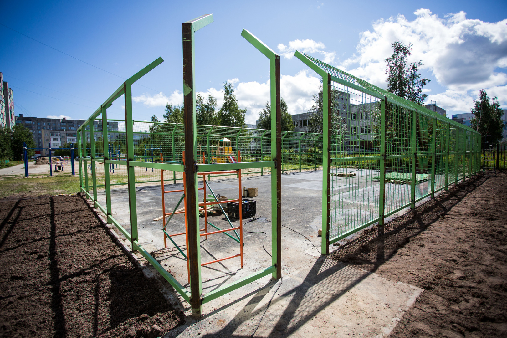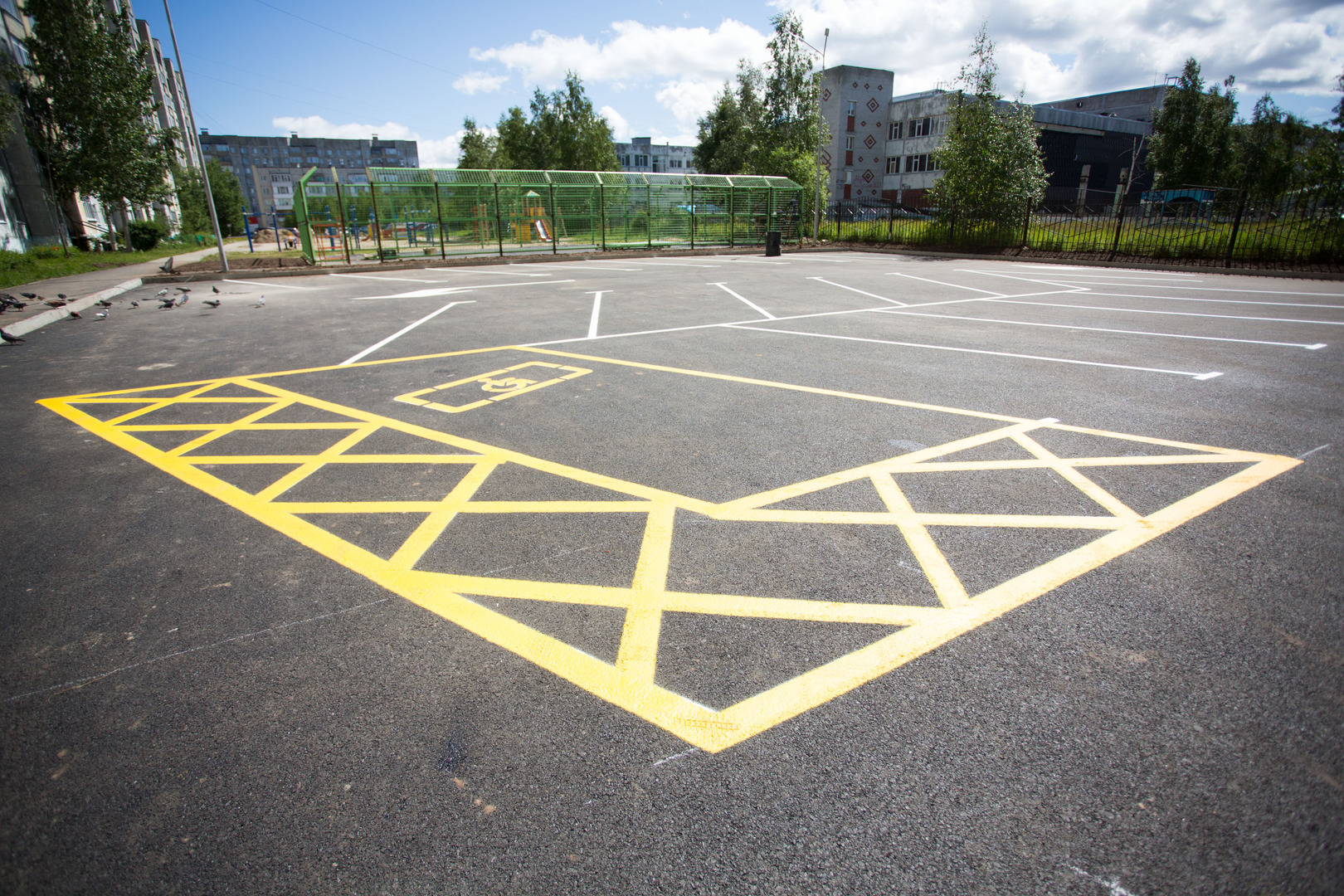 Благоустройство придомовой территории по проспекту Пролетарскому, 12 почти завершено. Работы выполнены на 90 процентов. Там появились новый тротуар, ограждения, спортивная площадка, расширено парковочное пространство.