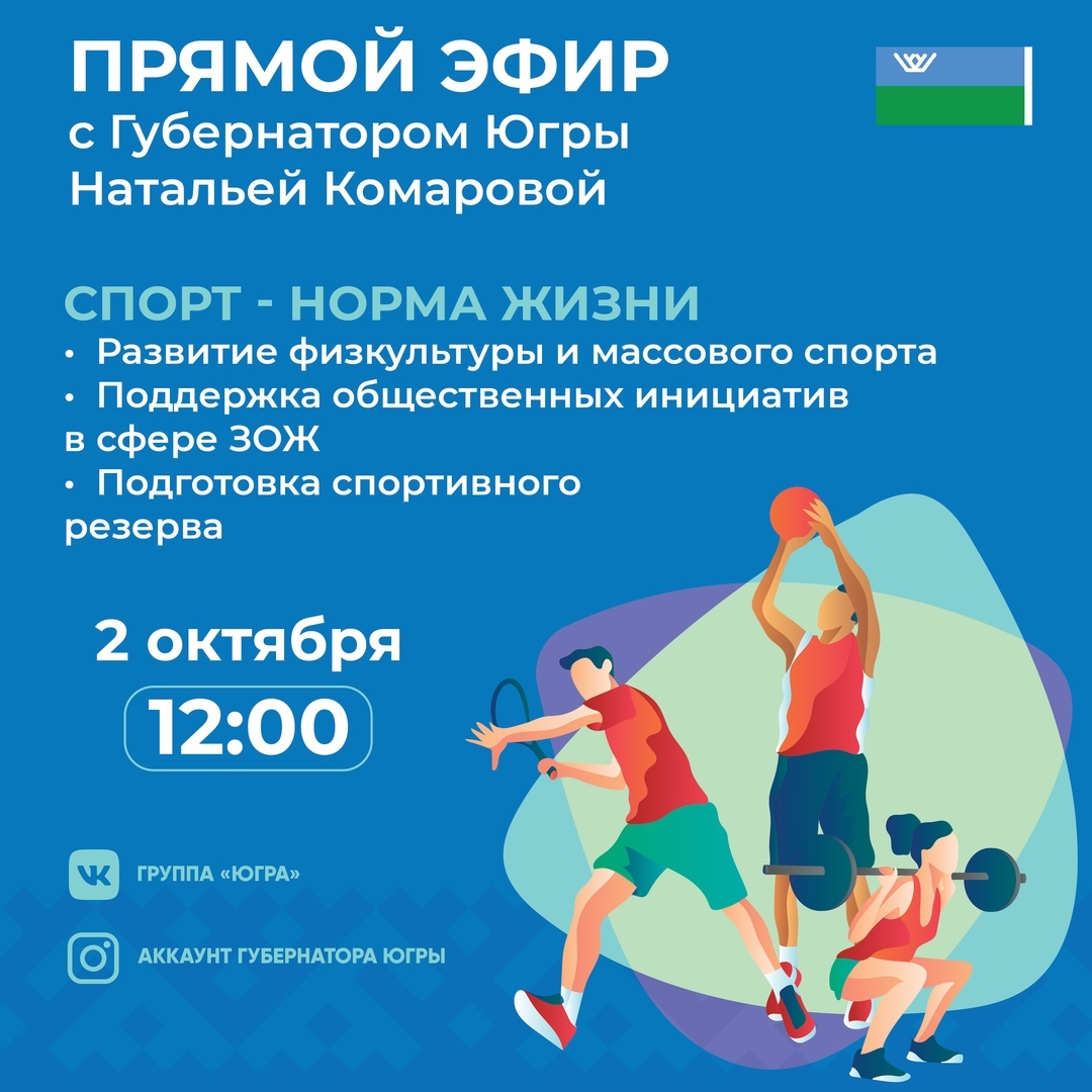 Губернатор региона Наталья Комарова в прямом эфире встретится с мастером спорта России международного класса Антоном Гафаровым, двукратным чемпионом мира по биатлону, обладателем малого Кубка мира Дмитрием Ярошенко, главами муниципальных образований, департаментом физической культуры и спорта, сообщает vk.com/shtabugra.