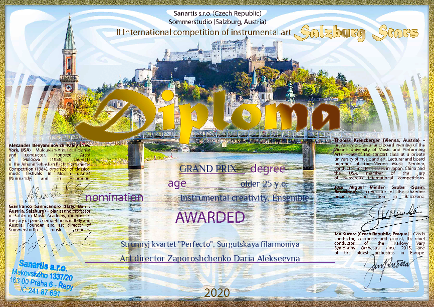 Струнный квартет «Perfecto» Сургутской филармонии удостоен Гран-при II Международного online-конкурса инструментального творчества "SALZBURG STARS", который проходил в музыкальной столице мира – Зальцбурге. Еще одно достижение сургутских музыкантов – звание лауреатов первой степени VIII Международного конкурса «Музыкальная шкатулка» в номинации «Струнные инструменты».