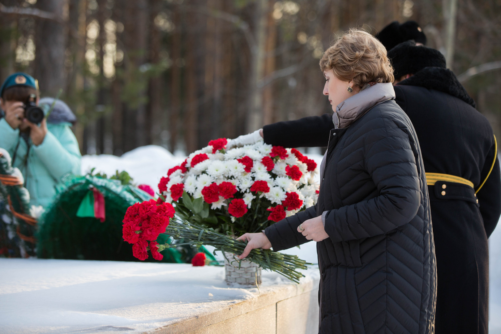 Присутствующие почтили память героев минутой молчания и возложили цветы к мемориалу.