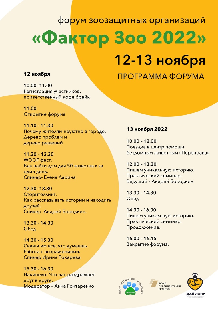 12-13 ноября 2022 года в городе Сургуте пройдет третий Форум зоозащитных организаций Югры и Ямала, организатором которого выступает РОД ПБЖ «Дай лапу». Проект реализуется при поддержке Фонда президентских грантов.