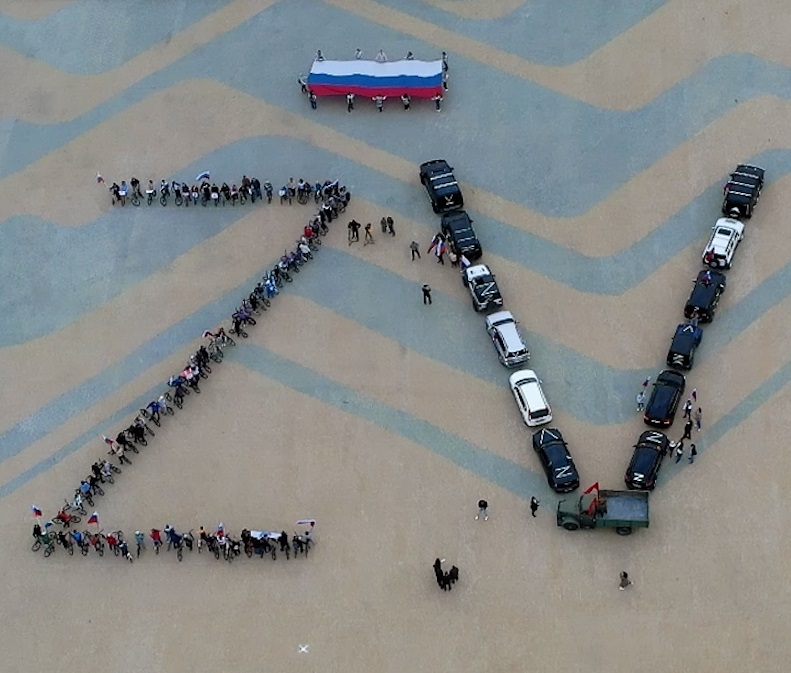 Представители вело- и автосообществ сплотились, выстроившись в символы «Z» и «V», развернув большой флаг России, выражая тем самым солидарность с нашими воинами и жителями освобождённых территорий.
