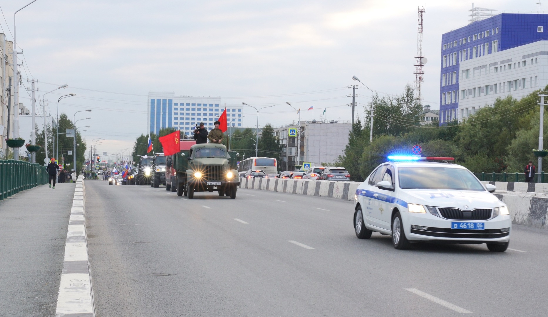Сбор и построение участников началось на территории Мемориала Славы. Сургутяне со знаменем Победы, флагами России, со звуковым сопровождением проехали по центральным улицам города в сторону главной площади, где и провели флешмоб.