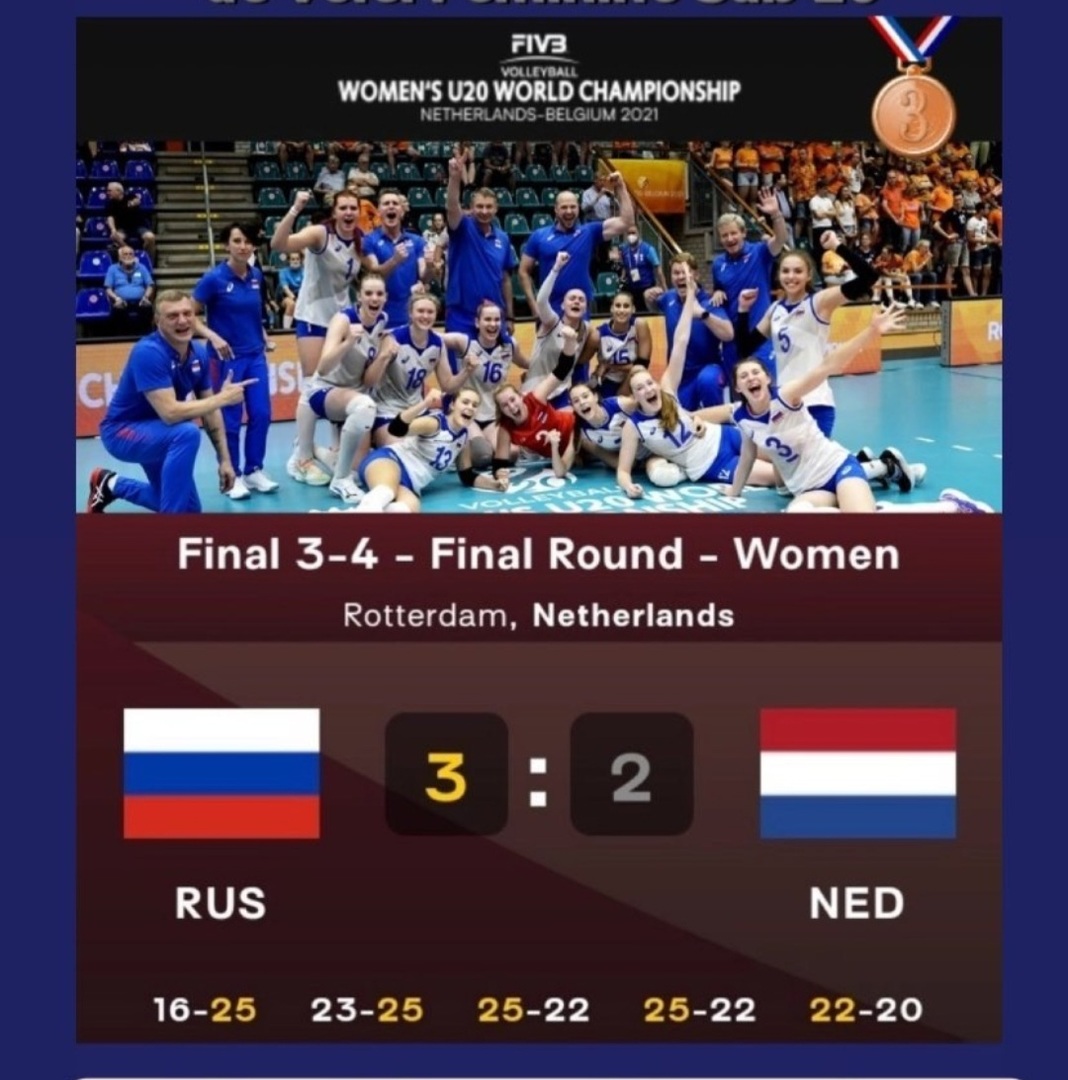 Молодёжный чемпионат мира по волейболу среди девушек (U-20) проходил с 9 по 18 июля в Бельгии и Нидерландах. В соревновании приняли участие команды из 16-ти стран. В матче за 3-е место волейболистки сборной России в городе Роттердам победили хозяек площадки – девушек из команды Нидерландов. Встреча завершилась победой россиянок на тай-брейке со счетом 22:20 (16:25, 23:25, 25:22, 25:22, 22:20).