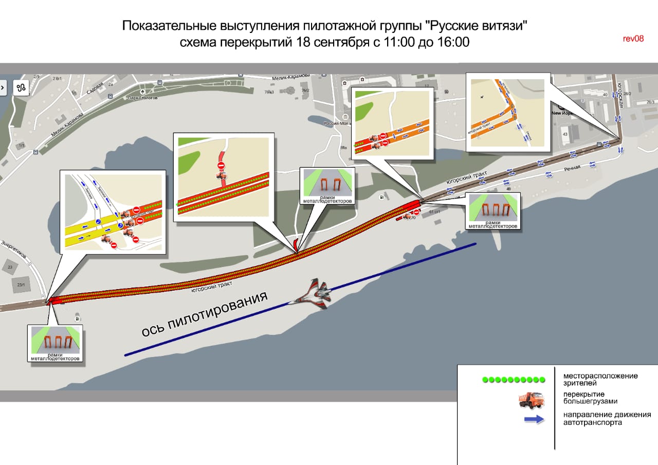 Пилотажная группа «Русские витязи» проведет показательные выступления в Сургуте 18 сентября. В связи с этим автомобильное движение на Югорском тракте от перекрестка с улицей Энергетиков до пересечения с со строящейся улицей Геологической перекроют с 11.00 до 16.00 (в схеме возможны изменения). Городские автобусы № 1, 5, 5А, 45, 47, 52, 114, 118 на время перекрытия будут курсировать в объезд по измененным маршрутам.