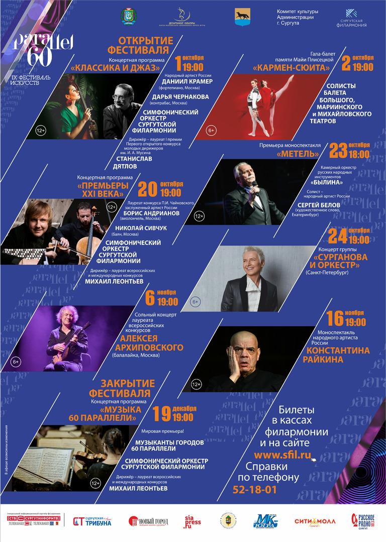 Сургут вновь объединит творческих людей. С 1 октября по 19 декабря в Сургутской филармонии пройдет IX Международный фестиваль искусств «60 параллель». Проект уже стал культурным брендом Югры. В этом году в нем примут участие именитые творческие коллективы и солисты из разных городов России, в том числе из Москвы, Санкт-Петербурга, Екатеринбурга.