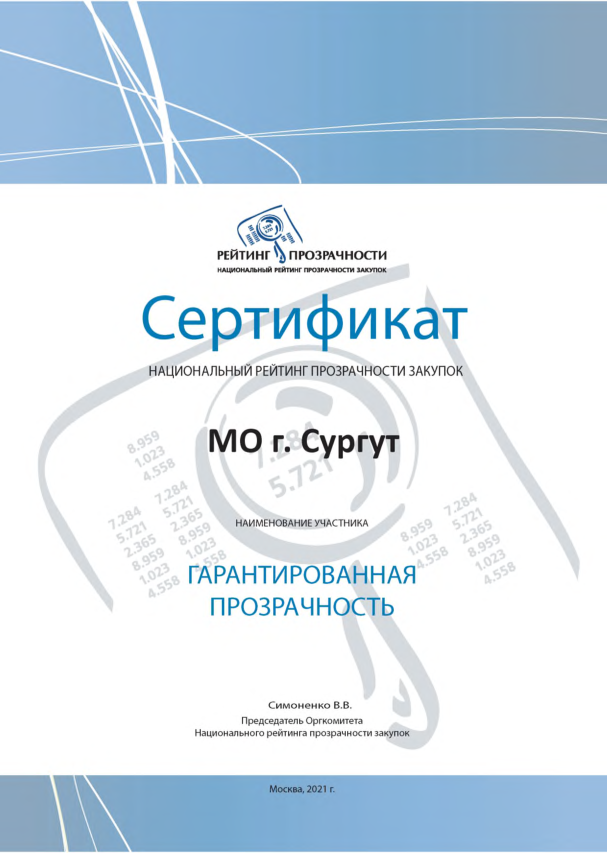 Национальный рейтинг формируется с целью мониторинга за состоянием и тенденциями рынка закупок. Он уже более 15 лет является инструментом общественного контроля за эффективностью расходования средств. Участники рейтинга – федеральные, региональные и муниципальные закупщики, а также лидеры российского корпоративного сектора. Статус «Гарантированная прозрачность» присваивается только 10 участникам. В этом году лидерами в муниципальном сегменте, кроме Сургута, стали Хабаровск, Владивосток, Нижний Новгород, Ставрополь, Южно-Сахалинск, Смоленск, Краснодар, Симферополь, Чебоксары.