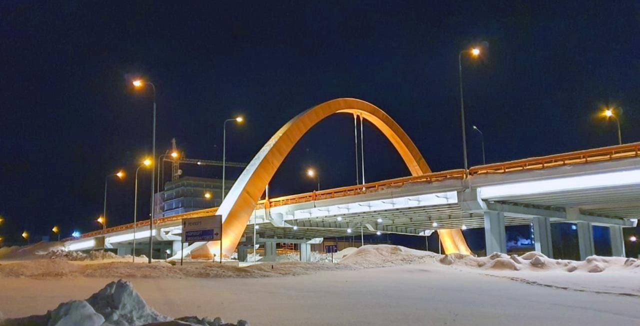 Общая готовность работ по освещению транспортной развязки порядка 50 %. С двух сторон подсвечены боковые линии развязки, смонтировано заливающее оранжевое освещение. Впереди этап монтажа светильников опоры.