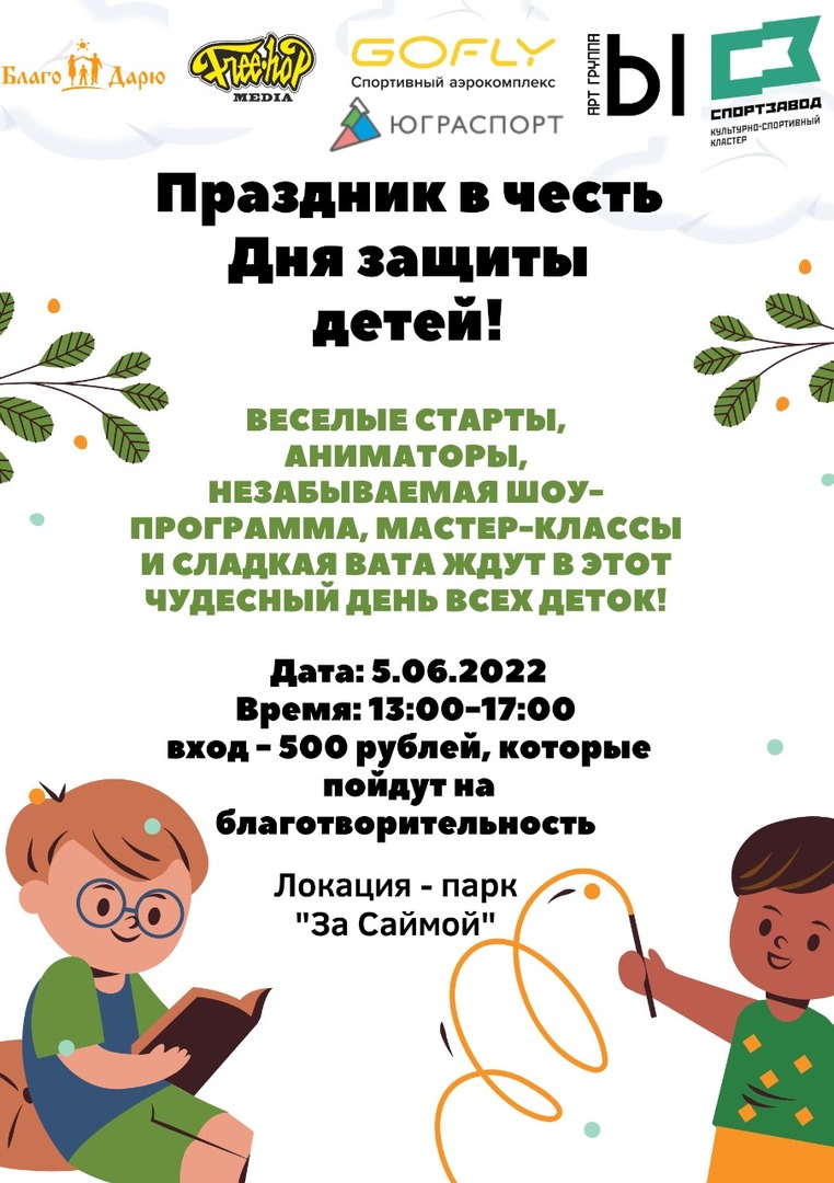В рамках праздника региональный благотворительный фонд помощи детям и молодежи с тяжелыми заболеваниями «Благо Дарю» проводит для детей и родителей увлекательное праздничное мероприятие. Всех желающих ждут веселые эстафеты, конкурсы, Шоу мыльных пузырей, Азотное шоу, мастер-классы, веломобили, аква-грим, сладкая вата, попкорн, яркие и веселые ведущие, много хорошей музыки и море подарков.