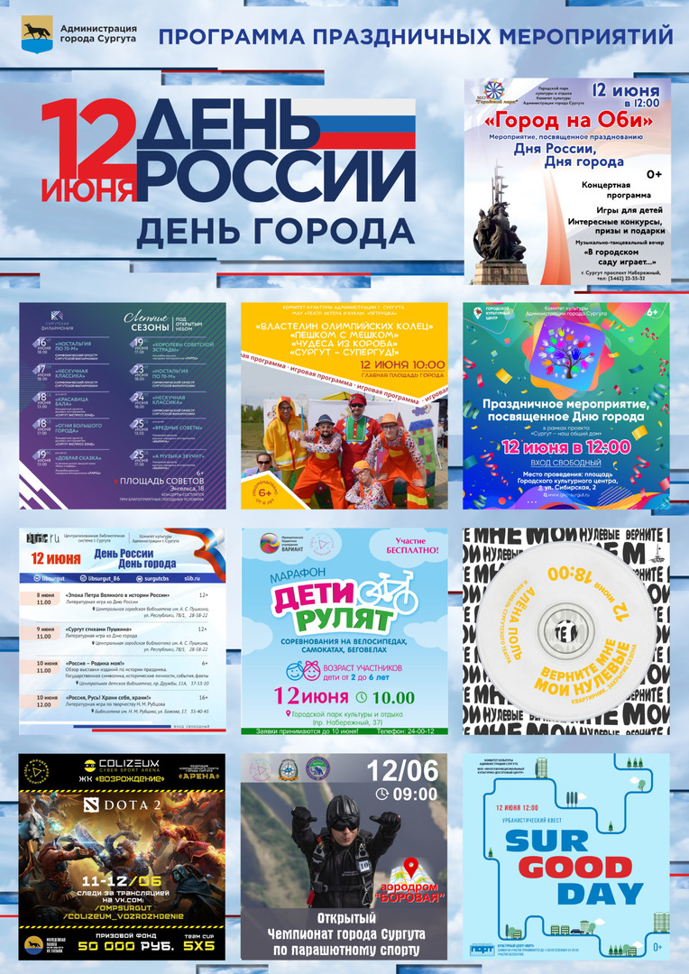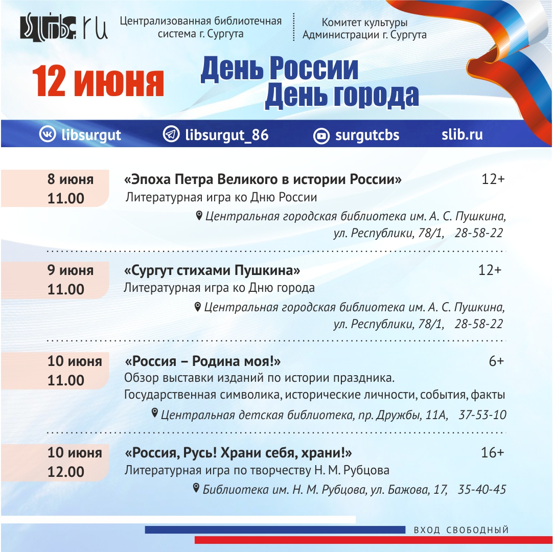 Множество ярких и разноплановых мероприятий пройдут еще до основного дня празднования 12 июня. Концертные и тематические программы, игры, выставки и акции организуют и проведут библиотеки и культурные центры города Сургута.
