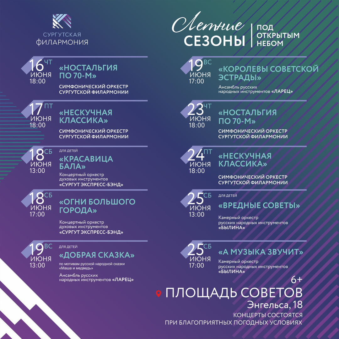 Также в 12.00 приглашает гостей Городской культурный центр на праздничное мероприятие «Сургут – наш общий дом». А Многофункционально культурно-досуговый центр - на урбанистический квест «SurGoodDaу». В 18.00 Сургутский музыкально-драматический театр проведет «Квартирник. Закрытие сезона». Есть возможность поучаствовать в песенном флешмобе онлайн «Песни о Родине» на сайте Сургутского колледжа русской культуры имени А. С. Знаменского.