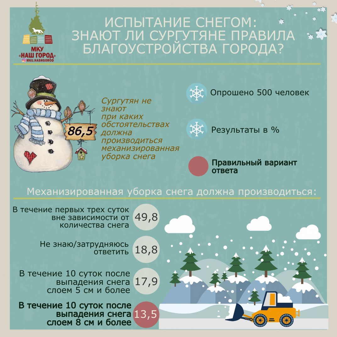 Почти 62% опрошенных ответили, что знают о существовании такого документа. При этом только каждый седьмой сургутянин знает, что механизированная уборка снега должна производиться в течение 10 суток после выпадения слоем в 8 сантиметров и более.