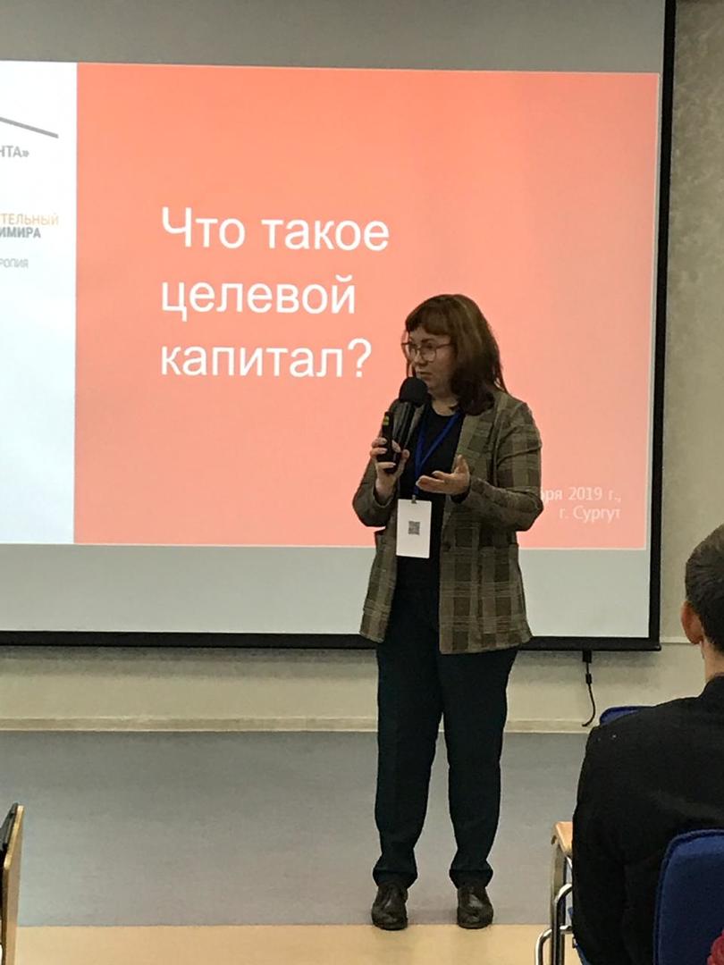 Содержательную часть семинара подготовил межрегиональный центр знаний по целевым капиталам и другим инструментам финансовой устойчивости некоммерческих организаций из Перми. По словам руководителя центра, целевой капитал – очень перспективный способ накопления и инвестирования. Это так называемый «вечный фонд»: деньги вложены в ценные бумаги, тратится только доход от акций, облигаций, недвижимости, и доходы ежегодно накапливаются, а сам целевой капитал неприкасаем. Закон, регулирующий вопросы целевых капиталов в России, был принят в 2006 году. Накоплен большой опыт, в первую очередь в Москве и Санкт-Петербурге. В Тюменской области есть два целевых капитала у вузов. Югра только на пути формирования механизма.