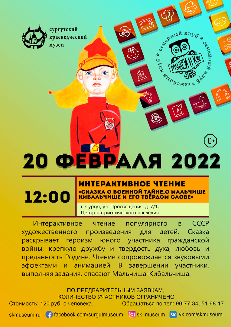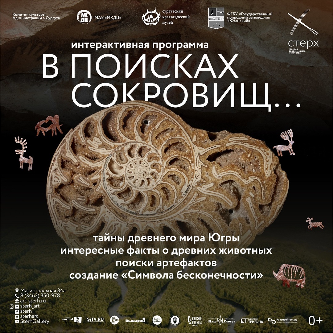 Галерея современного искусства «Стерх» приглашает юных сургутян на увлекательную интерактивную программу «В поисках сокровищ…». Участники смогут разгадать тайны древнего мира Югры, узнать интересные факты о древних животных, отправиться на поиски артефактов, создать свой собственный талисман «Символ бесконечности».