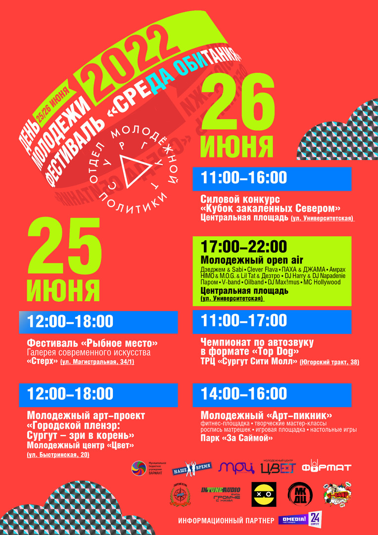 25 и 26 июня 2022 года в рамках празднования всероссийского Дня молодежи в городе Сургуте пройдет фестиваль «СреДА ОБИтания». Мероприятия, начнутся 25 июня в 12:00 сразу на нескольких площадках под открытым небом.