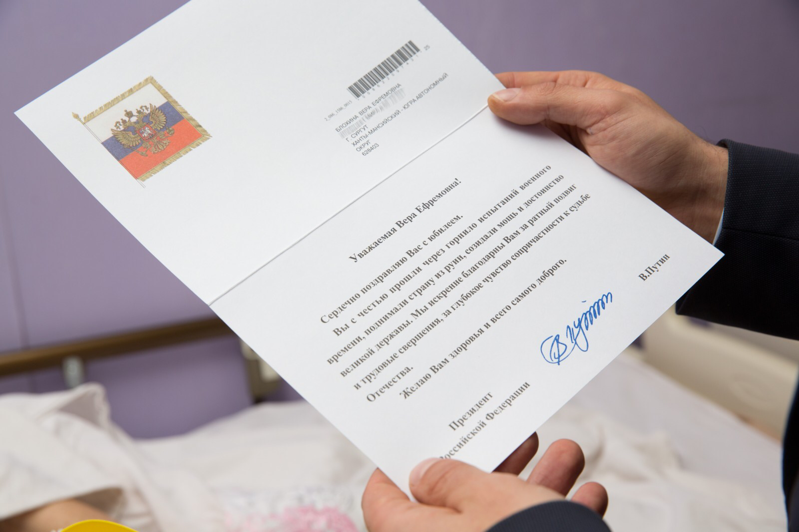 Письма из Кремля и букеты цветов в день рождения участникам трудового фронта вручили лично в руки представители Администрации города. Сургутянок Алину Некрасову и Веру Блохину поздравили по случаю 90-летнего юбилея.