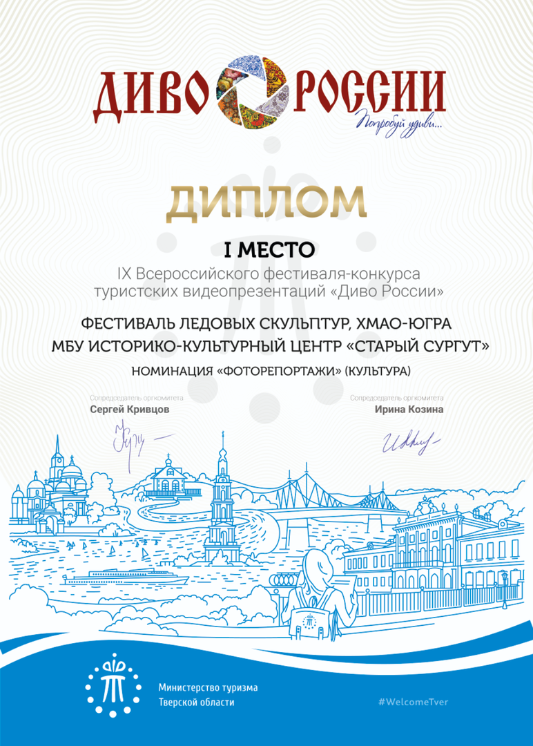 По результатам финала Всероссийского фестиваля-конкурса «Диво России», который в этом году состоялся в Твери с 28 по 30 октября, проект историко-культурного центра «Старый Сургут» – «Фестиваль ледовых скульптур» – вошел в число победителей, заняв I место в номинации «Фоторепортажи. Культура».