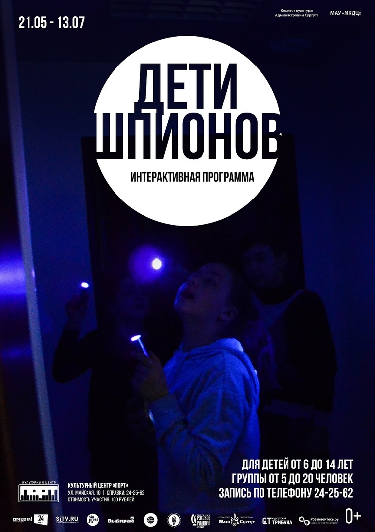 Культурный центр «Порт» приглашает юных сургутян на интерактивную программу «Дети шпионов» в рамках выставки «Тёмная сторона». В процессе программы участникам предстоит разгадать тайный шифр, используя всевозможные шпионские штучки и секретные устройства, которые способны проявить невидимые глазу объекты. Особенность программы – полная или частичная темнота. Программа предназначена для организованных групп от 5 до 25 человек в возрасте от 6 до 14 лет по предварительной записи |
