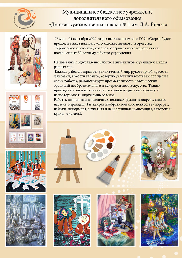Галерея современного искусства «Стерх» приглашает посетить юбилейную выставку работ учащихся Детской художественной школы имени Л.Н. Горды. 2022 году школа отмечает 50-летний юбилей со дня основания. Посетители смогут познакомиться с лучшими работами учащихся. Наравне с картинами, написанными в различных техниках (графика, живопись и т.д.), также будут представлены работы, выполненные в жанре декоративно-прикладного искусства |