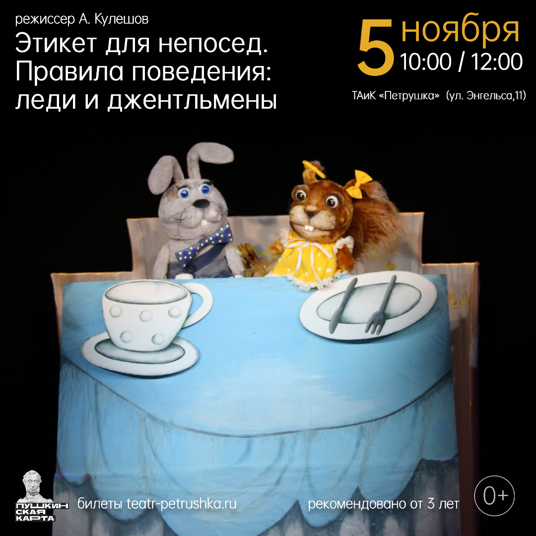 Что такое хорошие манеры? Умение быть вежливым? Или опрятным? Как вести себя в театре? Или в гостях? На эти и многие другие вопросы ответит наш познавательно-развлекательный спектакль «Этикет для непосед». В этой части спектакля речь пойдет о правилах поведения между мальчиками и девочками. Медвежонок после зимней спячки совсем забыл как нужно себя вести, а фея Вежливости вместе с детьми в игровой форме помогут ему вспомнить, что нужно помогать бабушкам и дедушкам, быть вежливым и внимательным и приходить на помощь к слабым. Билеты-онлайн teatr-petrushka.ru и по Пушкинской карте Продолжительность 30 минут. Рекомендовано для детей от 3 лет. |