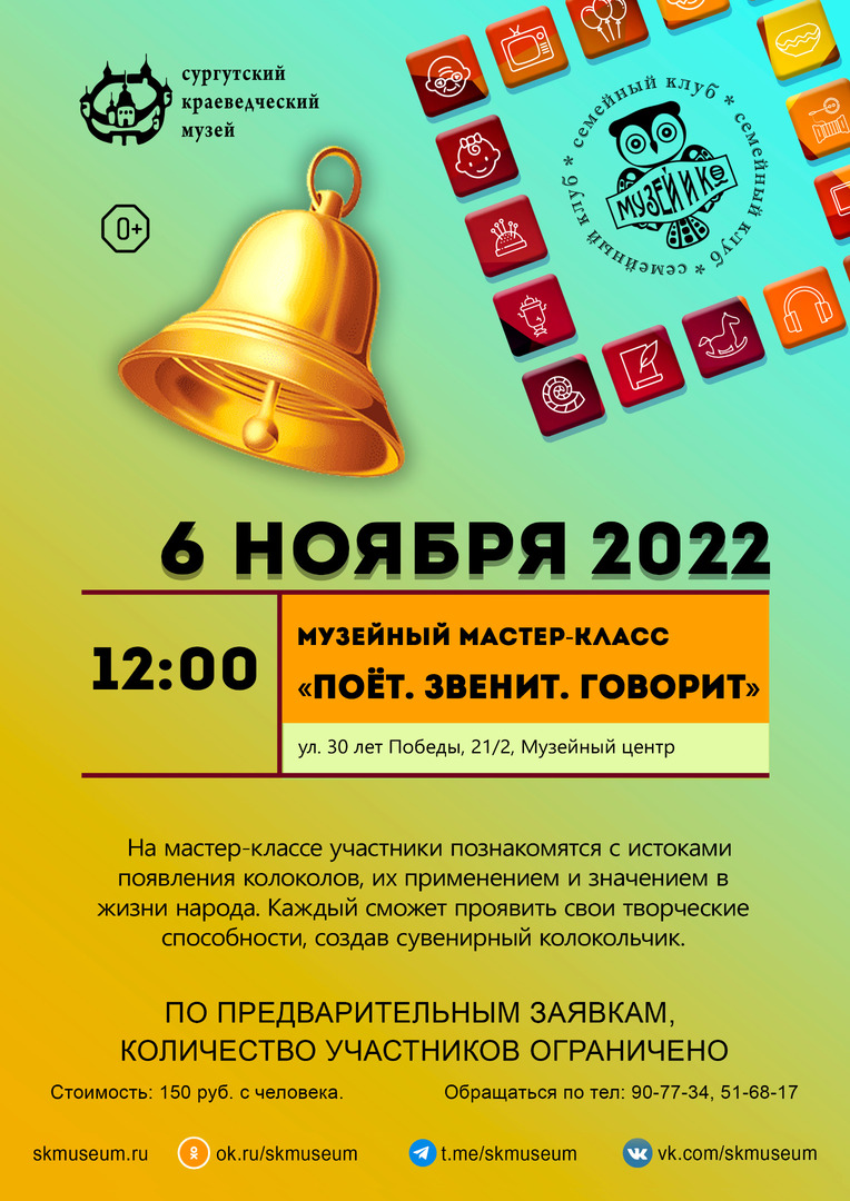 Семейный клуб «Музей и Ко» приглашает на музейное занятие «Поет. Звенит. Говорит». Участники мастер-класса познакомятся с истоками появления колоколов, их применением и значением в жизни народа. Дети и взрослые смогут проявить свои творческие способности, создав сувенирный колокольчик. По предварительной записи по тел.: 90-77-34 |