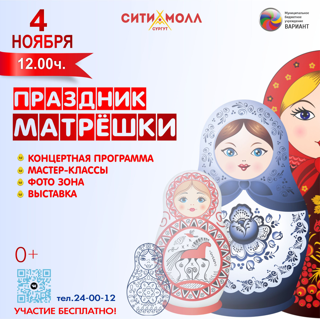 В программе праздника: - концертно-поздравительная программа; - серия мастер-классов по росписи деревянных заготовок матрешек, изготовление поздравительных открыток; - коллективно-творческое дело по росписи больших плоскостных матрешек; - выставка матрешек, выполненных молодыми жителями Сургута Целевая аудитория: 7+ Бесплатно |