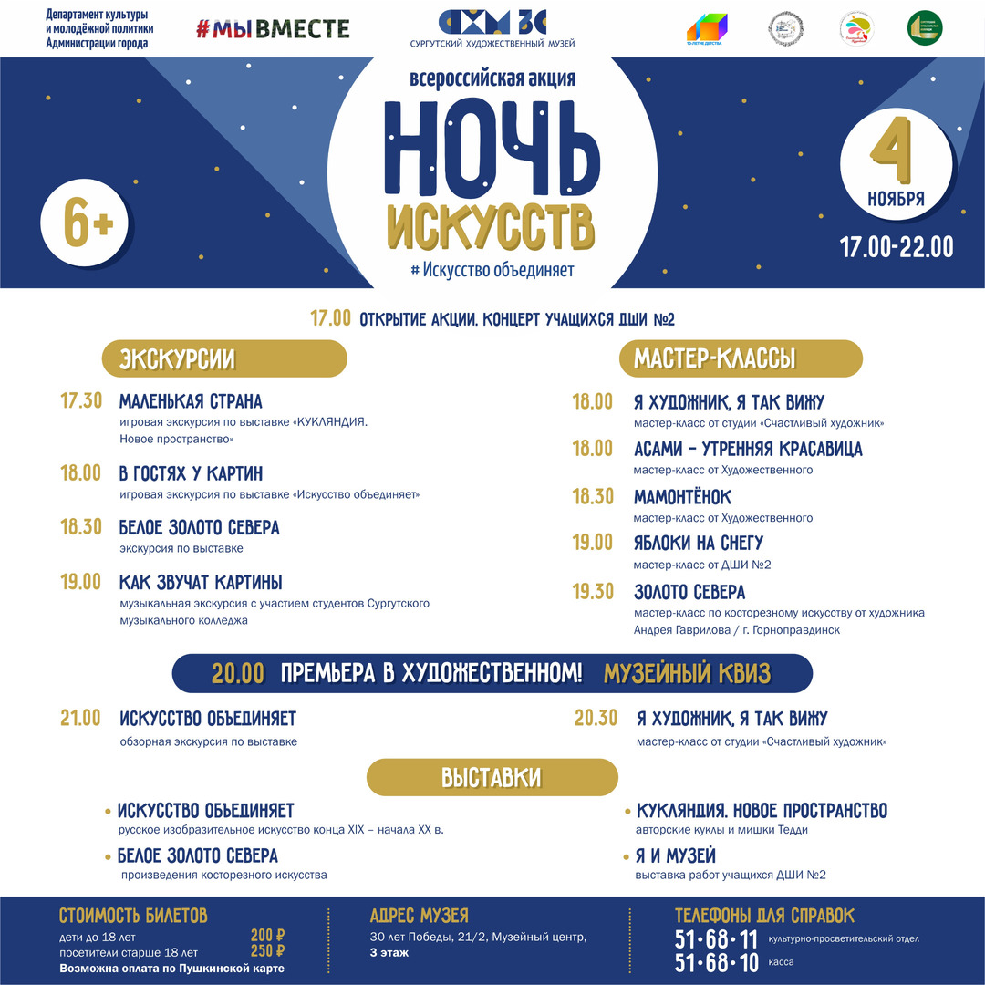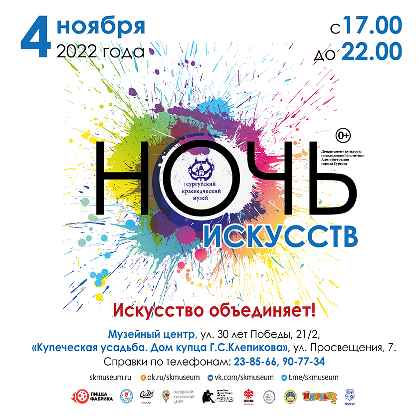 Сургутян и гостей города ожидает яркий круговорот событий: увлекательные и познавательные экскурсии тесно переплетутся с интереснейшими презентациями культурных новинок, просмотром тематического видео, выступлениями творческих коллективов, мастер-классами и множеством сюрпризов. Акция «Ночь искусств» будет проходить по единому билету на двух площадках: в Музейном центре и в «Купеческой усадьбе. Доме купца Г.С. Клепикова».